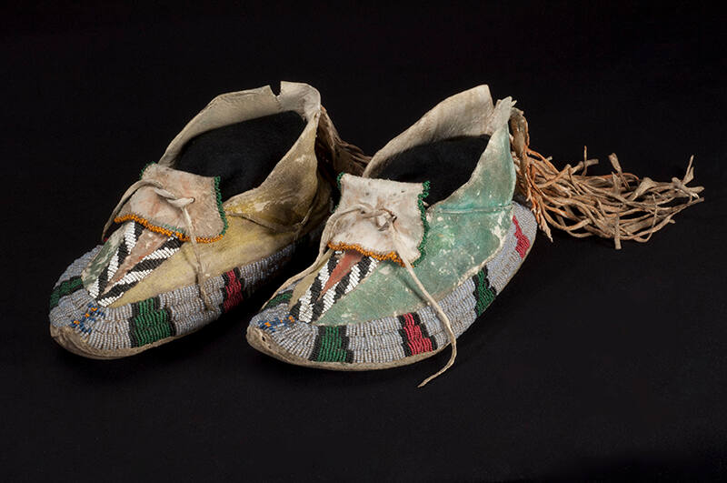 Label TextUte women combined colorful beading, painting, and fringing to create visually dynamic moccasins. The beaded elements are restrained with the inclusion of simple geometric around the border and two bands of beadwork on the vamp. The long fringe at the heels obscured the wearer’s footprints making his tracks disappear into ground as he walked.ProvenanceBob Doyle, Lake Placid, New York; Morning Star Gallery, Santa Fe, New Mexico