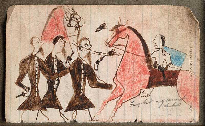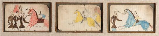 Label TextThese three small drawings illustrate the Sioux’s deftness at attaining war honors against U.S. army soldiers. The first drawing shows three uniformed soldiers challenging a single Sioux warrior. The warrior has succeeded in touching the first officer and possibly knocking the pistol from his hand. The drawing in the center shows a Sioux warrior stealing two horses, likely from the army, and escaping unscathed. The last drawing shows a Sioux warrior touching a seemingly immobilized officer on the head. (also see T0370 and T0372)