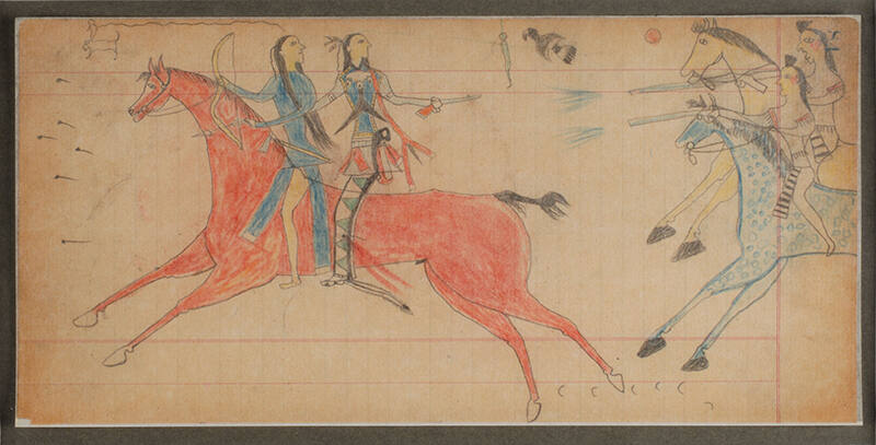 Label TextIn this drawing, the artist, Sitting Bull, documented an unsuccessful horse raid by two fellow Inunaina (Arapaho) men, Eagle Chief and Dog, who are identified by their name glyphs. Young men, anxious to establish themselves, often carried out horse raids together. Here Eagle Chief and Dog flee on Dog’s horse while two Apsalooke (Crow) warriors fire rifles at them. They ride double because Eagle Chief’s horse was mortally wounded. Blood flows from a gun shot wound in Eagle Chief’s leg. Dog will receive an important war honor, or “coup”, for saving his compatriot.