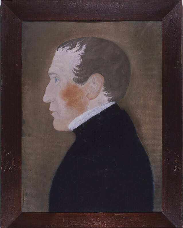 Label TextRuth Henshaw Bascom is an example of an artist whose work progressed from a hobby to a professional career. As a minister’s wife, Bascom began drawing as a pastime, but was soon traveling to create portraits on commission. She kept a daily journal in which she recorded making over a thousand portraits for money, services in kind, and as tokens of affection. Bascom rendered all her portraits in life-size profile. In order to create a realistic image, she first outlined a cast shadow of the sitter on her drawing paper. She then colored the picture using pastel crayons and, at times, added pieces of foil for jewelry. The portrait of her brother, Horatio Gates Henshaw, is one of Bascom’s more compelling character studies with the heavy lined brow and strongly contoured nose.Exhibition History“Folk Art from the Collection of the New York State Historical Association,” Museum of American Folk Art, NY, January 11, 2000 – February 18, 2000.