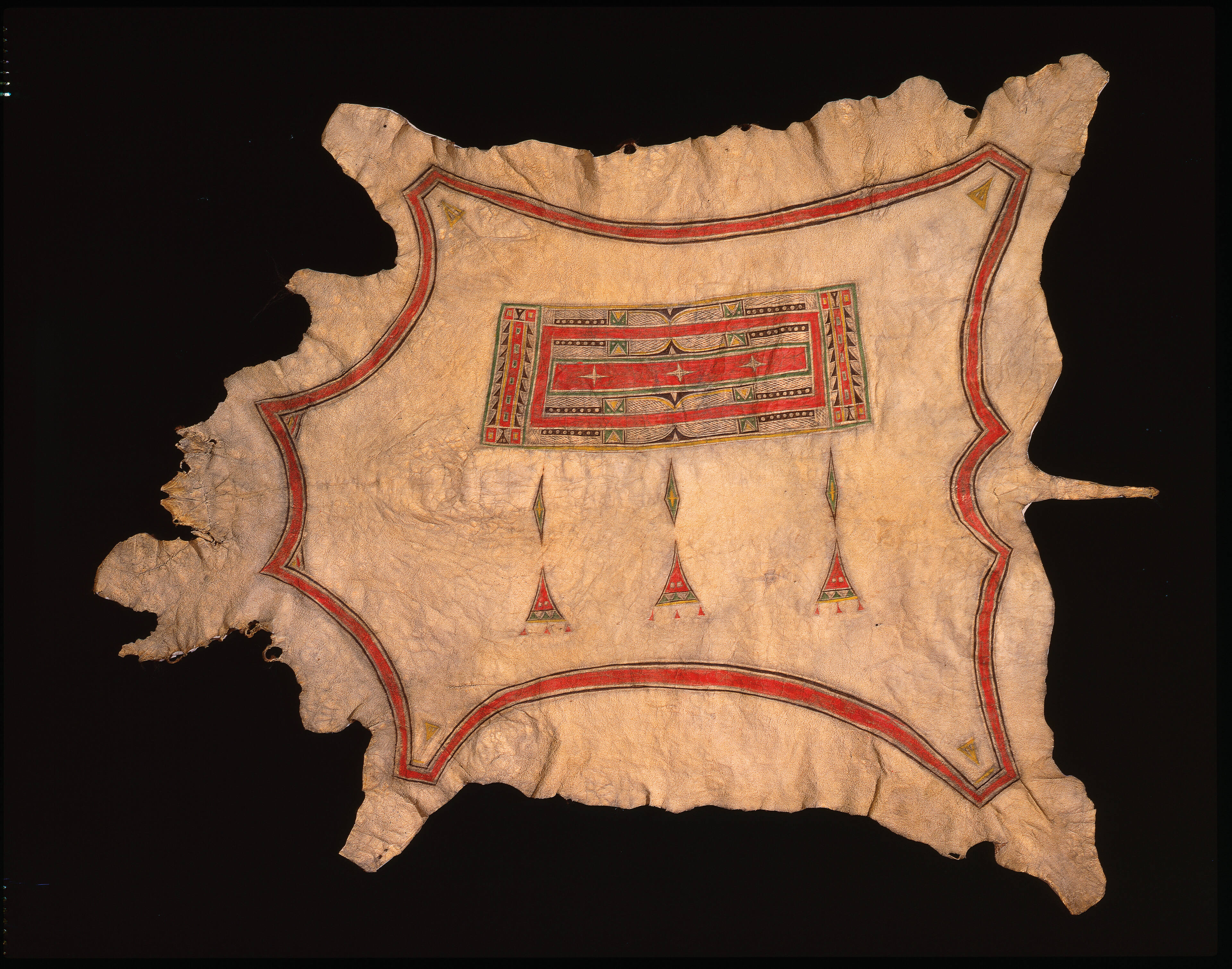 Label TextThis painted pattern on buffalo hide robes is referred to as the “box and border” design, and was particularly seen, with distinct variations, among the Sioux and Arapaho. Hides with this pattern were worn by child-bearing women, with the buffalo’s head to the left. Early robes such as this had incised designs and often employed cross-hatching. The pattern has been interpreted as representing the buffalo and the earth, both suppliers of life-giving necessities, but this is not certain. These robes used a minimum of colors but later robes, produced after commercial pigments became available, are often more colorful.Exhibition History"Art of the American Indian: The Thaw Collection," The Cleveland Museum of Art, Cleveland, OH, March 2, 2010 - May 30, 2010; Minneapolis Museum of Art, Minneapolis, MN, October 24, 2010 - January 9, 2011; Dallas Museum of Art, Dallas, TX, April 24, 2011 - September 23, 2011; Indianapolis Museum of Art, Indianapolis, IN, December 4, 2011 - February 12, 2012.