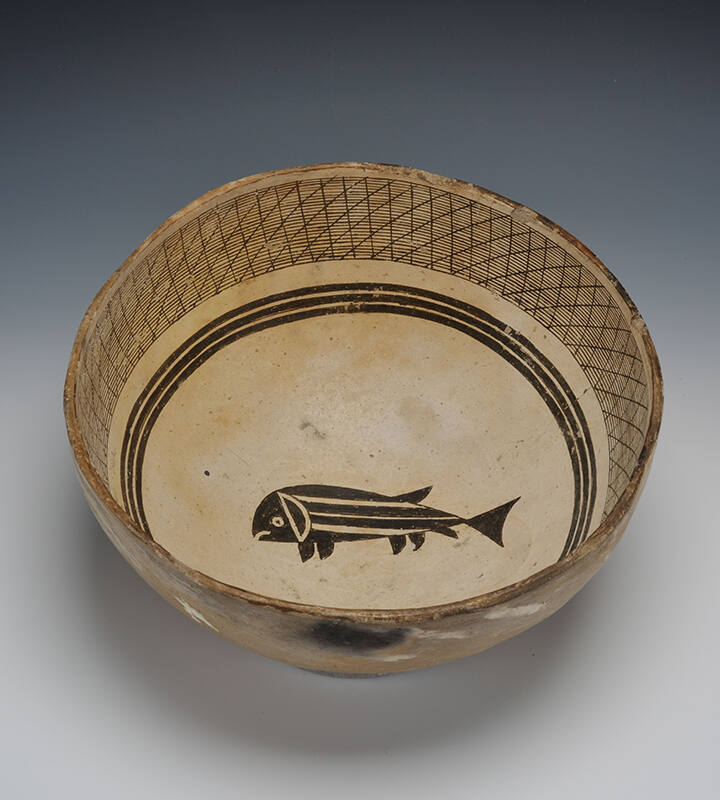 Label TextAnimals often appear in pairs when painted on bowls, but the fish on this is solo. Mimbres potters sometimes painted fish in such detail that their species can be identified. This fish awaits identification but might be a bone fish. Mimbres and other Southwestern people consumed local fish. Dried fish imported from the Gulf of Mexico may have also figured into the Mimbres’ diet.ProvenanceAnthony Berlant, Santa Monica, California; William and Barbara Street, Tacoma, Washington; William Channing, Santa Fe, New Mexico