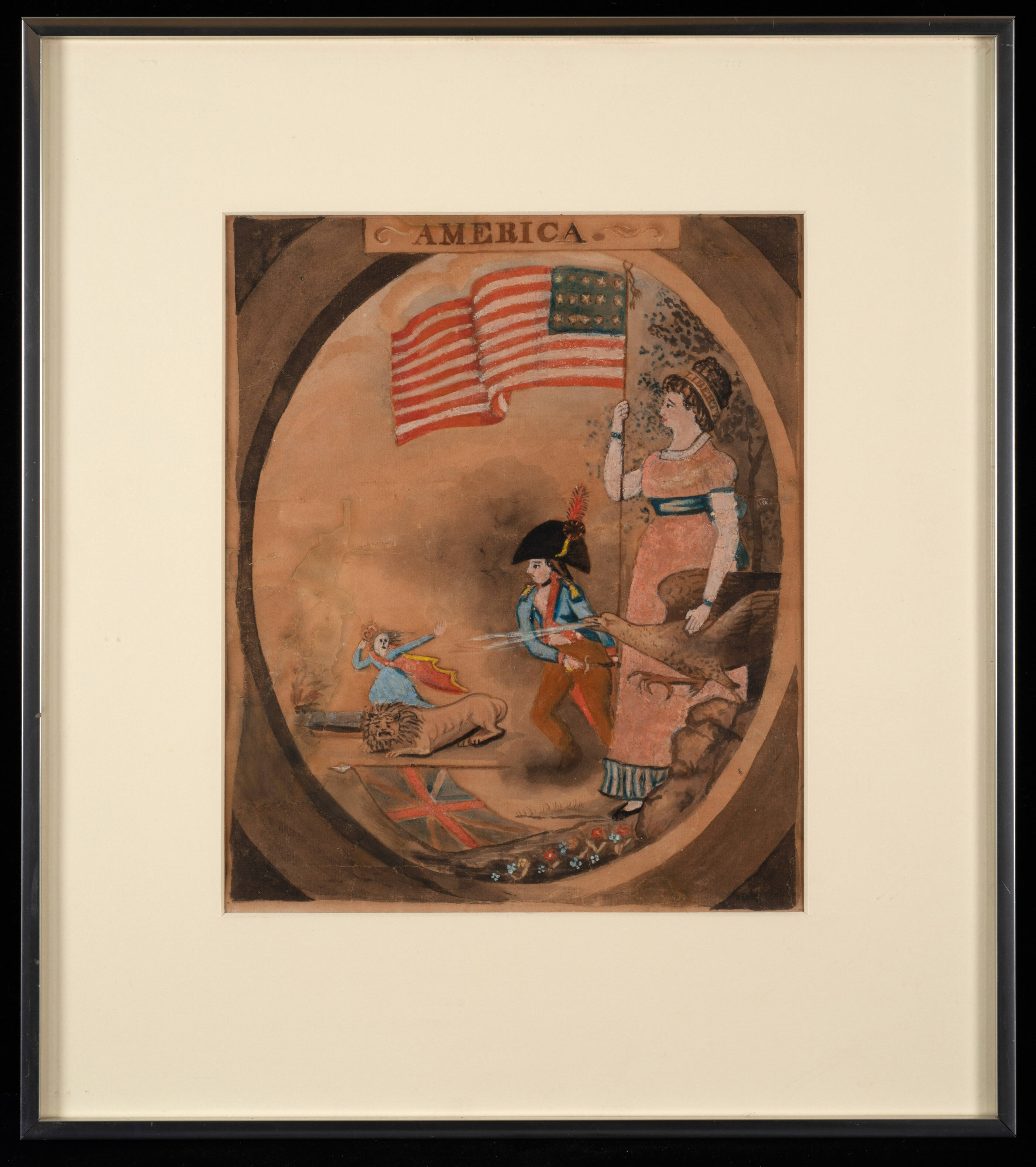 Label TextThe inscription on the back of the piece reads: "This picture first belonged to Sally Mallory, then to her daughter Emeline Mallory Utley, then to her daughter Mary Ann Utley Skeele, then to her daughter Lillei (?) Skeele Barnes, then to her daughter Harriett Eva Barnes Eastwood, then to her daughter Dorothy Eastwood who is to have this picture when Irving Mills is through with it. Sally Mallory was Irving's great great grandmother and she had no picture when first married and it always hung by the fire place in her little log cabin home. If Dorothy Eastwood should not be living it should go to Robert Barnes."