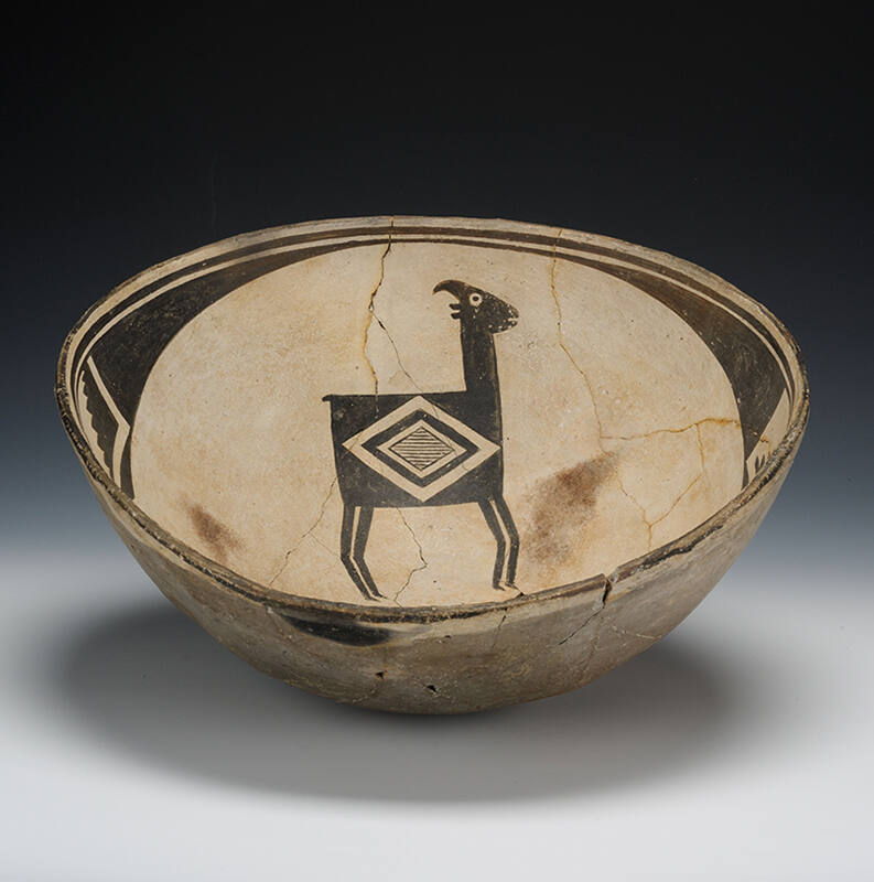 On the bowl above, a pair of goats with nimble-looking legs seems ready to spring away. Geometric designs of nested diamonds decorate their sides. Mimbres potters are renowned for their creativity in depicting diverse aspects of their cultures and spirituality as well as expressing pure imagination.