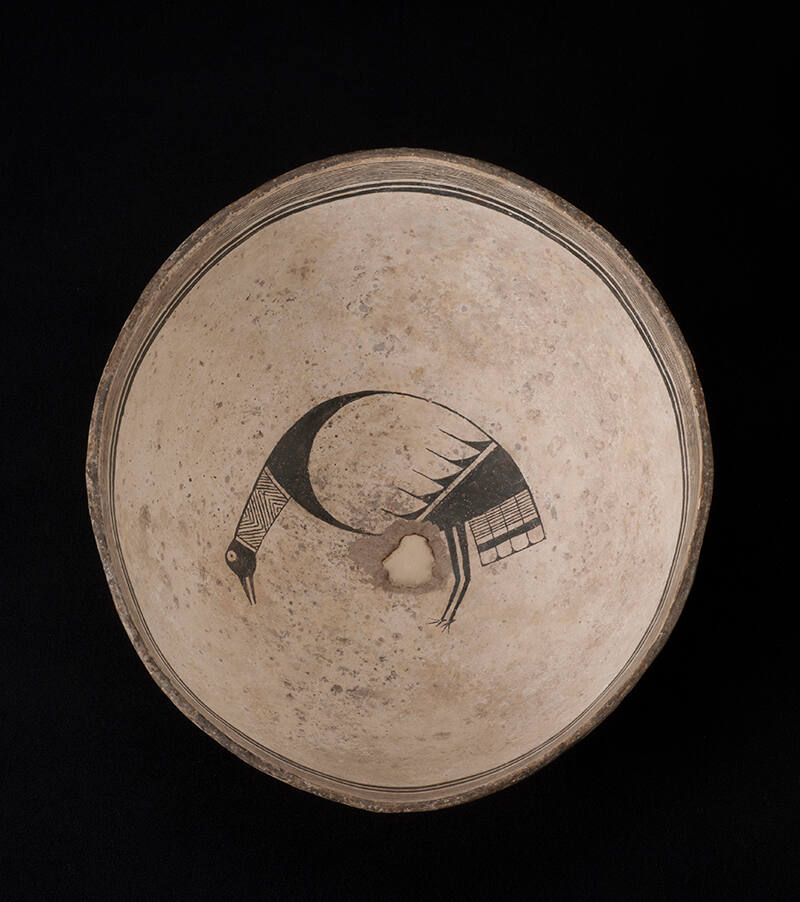 Label TextThe Mimbres, the first ancient Southwest people to adopt agriculture, produced exceptional painted pottery at the turn of the first millennium (1000-1150 A.D.). Engaging scenes from the Mimbres world were realistically rendered, recording both daily life and mythology. On this bowl, a well-fed bird cranes its neck in search of food.