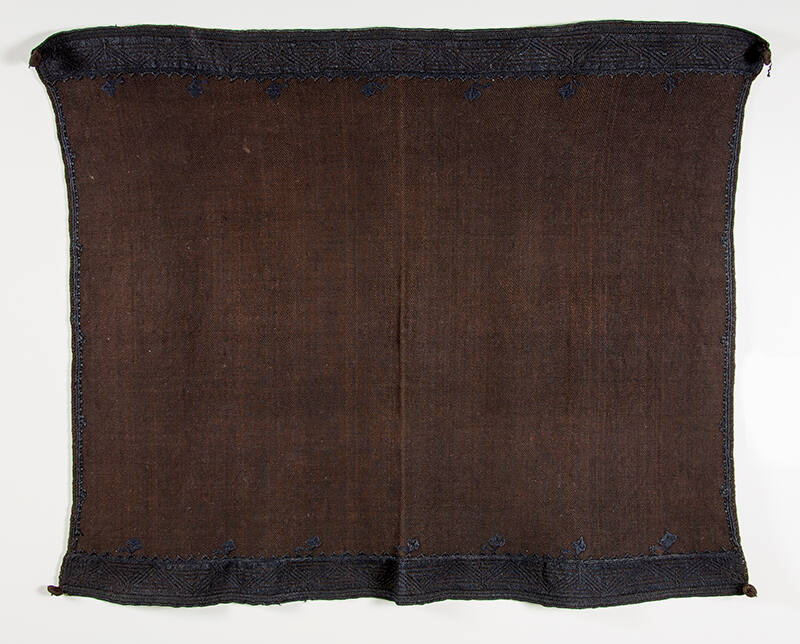 Label TextSheep became available early in the seventeenth century and Pueblo weavers made blankets from the new wool as well as from cotton on traditional upright looms. Mantas, a Spanish word for blanket or wrap, were worn either as a dress or as a shawl. The undulating design embroidered with deep indigo blue wool thread at top and bottom border represents water or waves and the stacked diamonds represent clouds. In the parched southwest water is a significant ceremonial symbol. The dark blue indigo embroidery around the edge of black mantas is an extremely subtle aesthetic. Men were the traditional weaves of Pueblo textiles as opposed to Navajo textiles which women produced.ProvenanceGerald Peters, Santa Fe, New Mexico