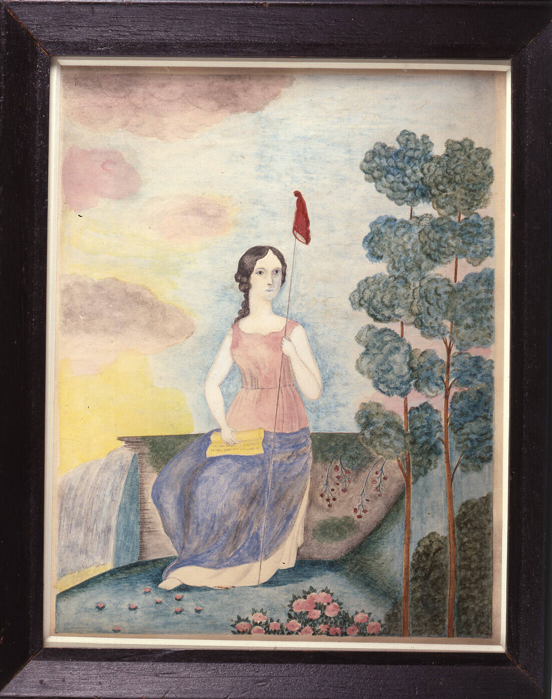 Label TextNineteenth-century folk artists depicted the allegorical figure of Liberty in a variety of settings. Here she can be seen at America’s most famous natural feature.Exhibition History"Liberties With Liberty, Museum of American Folk Art", New York, NY, February 2, 1986 - May 18, 1986; Illinois State Museum, Springfield, IL, November 23, 1986 - January 25, 1987; Detroit Historical Museum, Detroit, MI, February 10, 1987 - April 26, 1987, Craft and Folk Art Museum, Los Angeles, CA, June 1, 1987 - August 9, 1987.