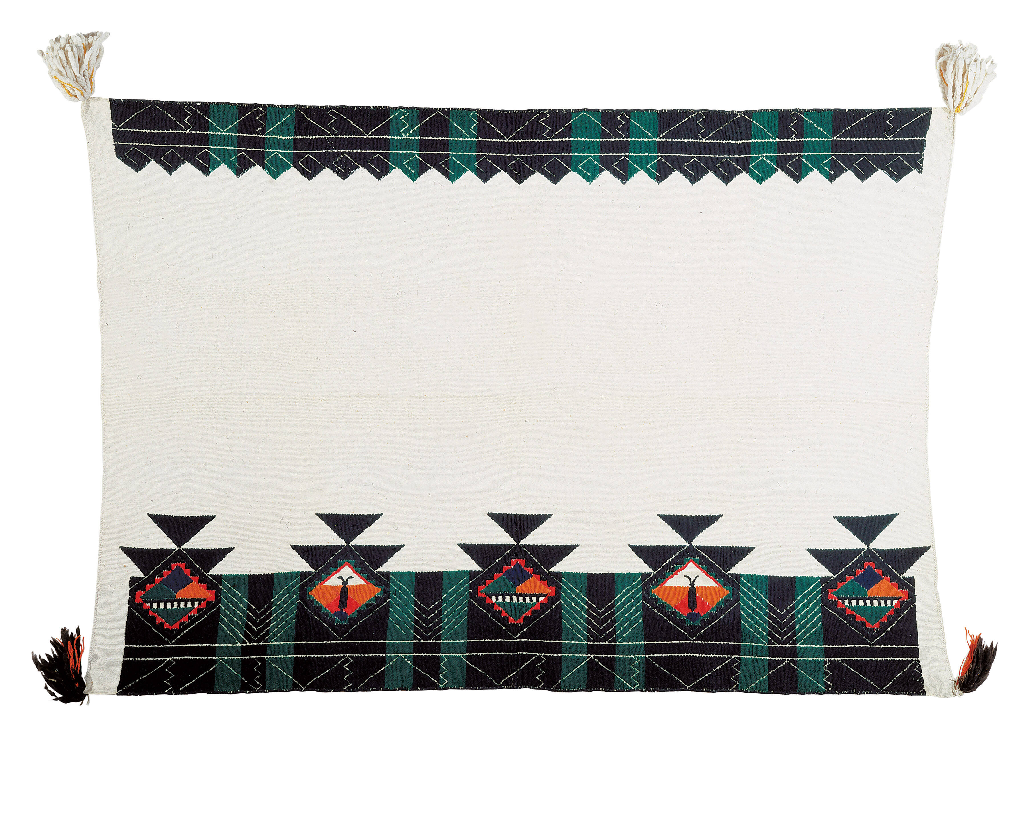 Label TextThis manta has been decorated with embroidery along its top and bottom edge. The lower embroidered section has five multicolored diamonds that enclose stylized butterflies and abstract rain clouds, symbols of fertility and renewal.The butterfly symbolizes fertility in part because of its ability to pollinate plants. Geometric patterns similar to those seen in prehistoric pottery show through the embroidered areas, creating a negative design element.ProvenanceGerald Peters, Santa Fe, New Mexico