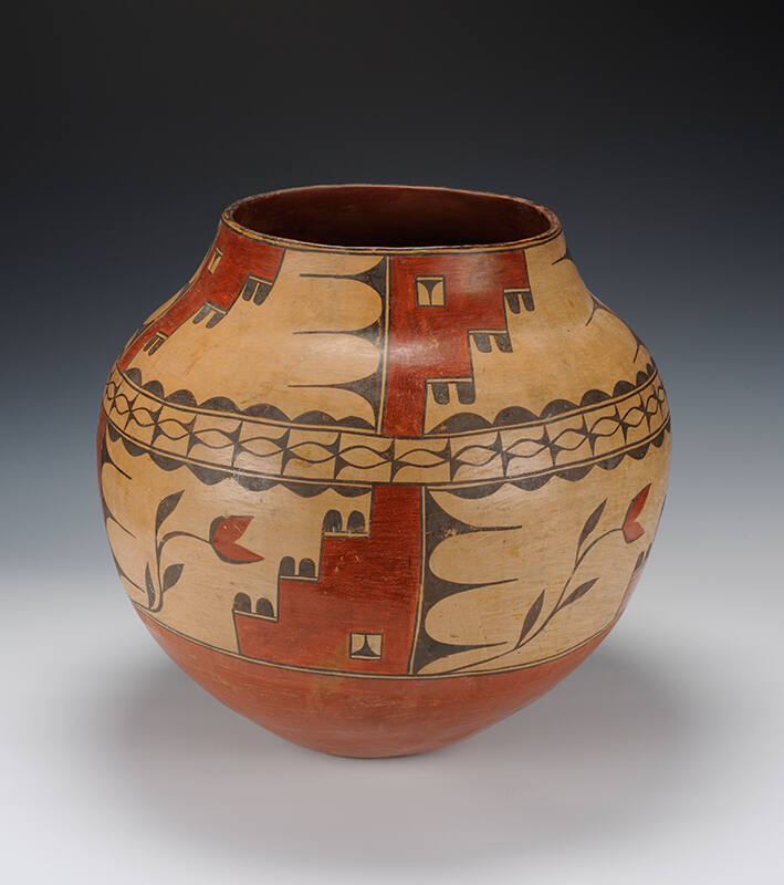 Label TextThe Zia pueblo was another great source for eager travellers who wanted to buy extraordinary pottery work. Zia potters shaped the jars to have a high shoulder and painted the designs in black and smaller amounts of red. This gracefully curving flower is an example of a larger naturalistic design aesthetic that Zia potters employed.ProvenanceGerald Peters, Santa Fe, New Mexico