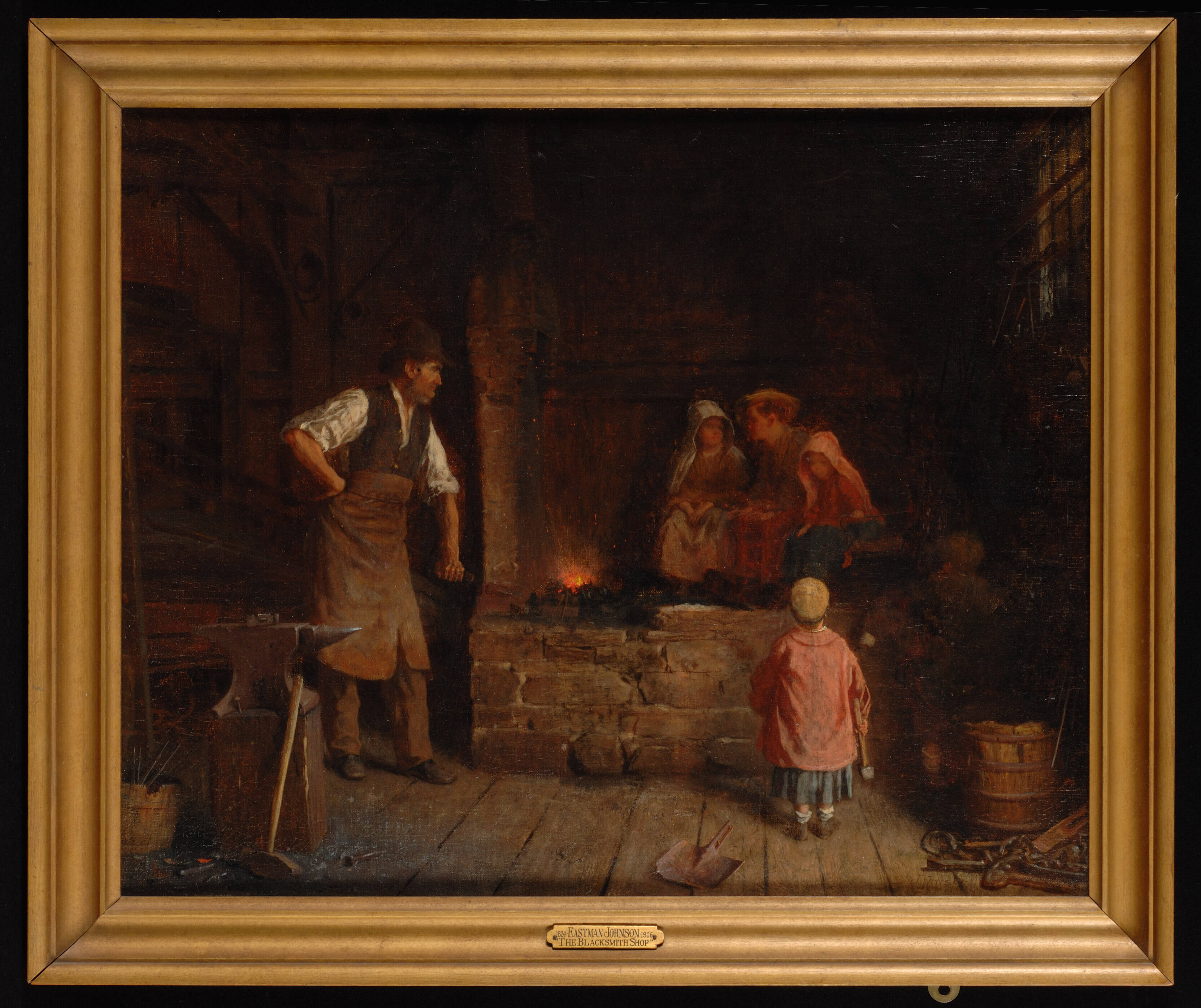 Label TextThis painting centers on an iconic image of a rural craftsman, Solomon R. Newman of Milford, Pennsylvania, entertaining a group of youngsters. Observing a blacksmith in his shop was an exciting experience for children in the 19th century. In this painting, the blacksmith is the object of fascination for those who gather to watch him practice his craft. He embodies individuality, self-reliance, compassion, and skill.Eastman Johnson is best remembered today for his talent as a genre painter. Johnson began as a successful portrait painter, capturing images of Longfellow, Emerson, and Hawthorne, but in 1858 turned to American genre themes such as depictions of African Americans, Native Americans, politics, and the frontier. Johnson concentrated on themes that recorded and ennobled rural American life before the Industrial Revolution.