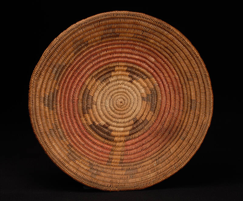 Label TextNavajo baskets such as this one play a central role in wedding ceremonies. The bride makes cornmeal using red, blue, and white corn, which respectively symbolize health, happiness, and wealth. The cornmeal is placed on the basket and positioned between the bride and groom. The bride’s father sprinkles corn pollen, a symbol of fertility, in a quartered cross pattern over the cornmeal and around the edge of the basket. The couple then eats cornmeal and pollen from the quartered cross and the center. The quartered cross relates to the four cardinal directions, and the center of the basket refers to the Navajo creation story, representing the center of the earth from which the first Navajo people emerged. ProvenanceClaire Zeisler, Chicago, Illinois; Morning Star Gallery, Santa Fe, New Mexico