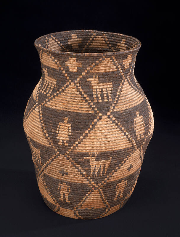 Label TextSturdy and lightweight baskets were the most important type of container for the Yavapai. The baskets became a trade specialty and they were traded with other native groups and sold through Anglo traders for the tourist market. This coiled basket is made of devil’s claw and willow stitched around a three-rod foundation—a typical Yavapai construction. The Western Apache and the Yavapai tribes live together on several Arizona reservations and their baskets are very similar in form, material, and design. This basket’s pictorial design includes humans and deer.ProvenanceLarry Wendt, Santa Fe, New Mexico
