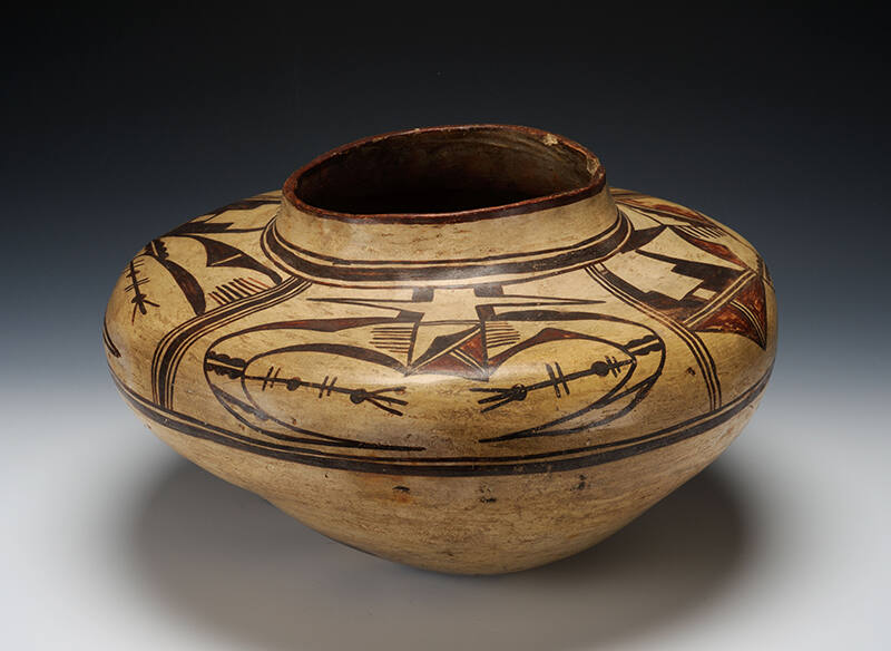Label TextIn the late 1890s, Nampeyo, a Hopi woman, reintroduced the ancient style of Sikyatki pottery (1325-1625) to a community that had largely ceased making ceramics. Sikyatki pots are distinctive for their low shoulders, linear design motifs and dramatic use of black, brown and white paint. Nampeyo’s influence on other Hopi potters was immediate and continues to the present.ProvenanceHarry Behn, Connecticut; Sotheby's Parke Bernet, New York City; Rick Dillingham, Santa Fe, New Mexico