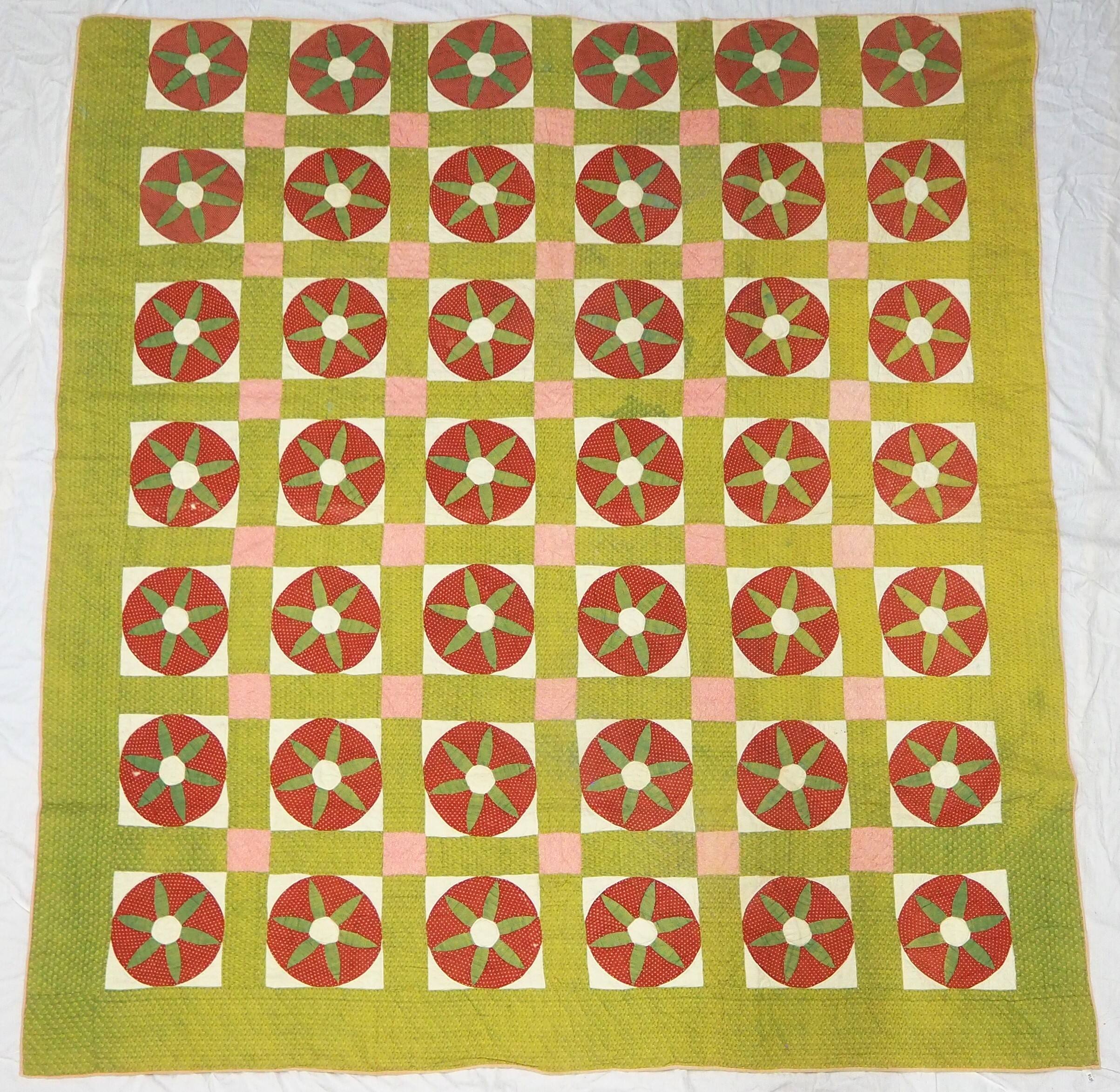 Combination patchwork, applique, and reverse applique quilt. Each block features a black-and-white dotted red cotton circle with inserted green print "leaves" around a central white circle, with white triangles added to make it a square. Sashing of a different green-on-green print cotton with boteh motif and clouded ground, with pink print squares diagonally where sashing "crosses".