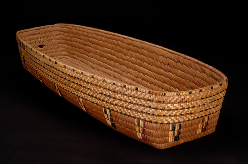 Label TextLocal roots, grasses, and bark provided Salish women with materials to construct sturdy yet beautiful cradles for their babies. Earth-toned cherry bark and bear grass embellish these cradles in a technique known as imbrication—decorative surface weaving over the structural foundation. This cradle’s pristine condition suggests that it was never used. Additionally, the sides are missing ties that would have secured the baby and its padding. ProvenanceMrs. Maria McKeen Allen; Taylor Museum (2970), Colorado Springs, Colorado