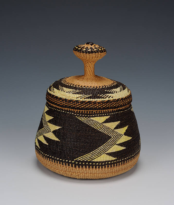 Label TextLower Klamath River weavers (Hupa, Yurok, Karok, Tolowa, Wiyot, and others) used twining techniques to construct a wide variety of highly decorated utilitarian baskets for food-related activities as well as baby carriers and caps. When the curio demand rose in the late 1880s and early 1890s, they developed newer forms including placemats, wall hangings, covered bottles, and lidded “trinket baskets,” the last specifically designed for display on shelves and mantels in Euro-American homes.Elizabeth (“Lizzie”) Hickox (1872-1947) specialized in the “trinket basket” form, producing small and delicate pieces with high, slender knobs on the lids. The baskets that she, along with her second daughter Louise (1896-1962), produced for the curio trade have the distinction of being among the finest and most individualized twined baskets known from California. Apart from the technical achievement, her work I distinguished by a reversed approach of subtle complexity that was appreciated by California’s premier basketry dealer, Grace Nicholson, who established a patronage agreement with Elizabeth Hickox in 1908.