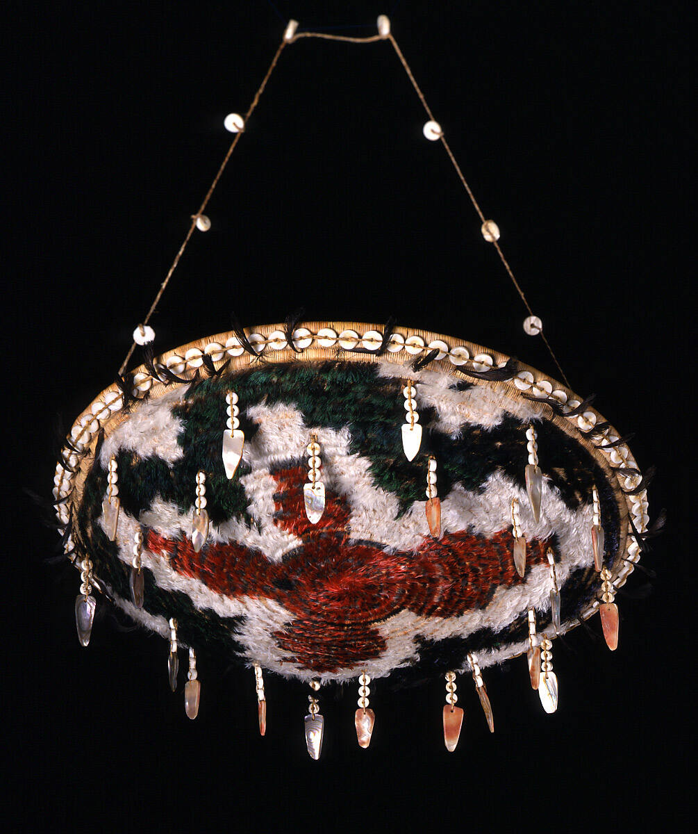 Label TextThese baskets, with their glowing mosaics of brilliant feathers, were often called "jewel" baskets and were used by the Pomoans as gifts to friends or to present to honored persons (c.f. Feder 1965, pl.31). In older days, they were burned at funerals or buried with their makers. This example was made with three rod coiling sewn with splints of sedge root. The feathers were gathered from the red crests of acorn woodpeckers, the green head feathers of mallards, white fluffies from other water birds, and the black crest plumes of California quail to embellish the basket rim. It was also decorated with white clamshell beads and short dangles ending with abalone shell pendants. (From the Catalog of the Thaw Collection of American Indian Art, 2nd ed.)ProvenanceGene Quintana, Carmichael, California; Jack D. Antle, Durango, Colorado