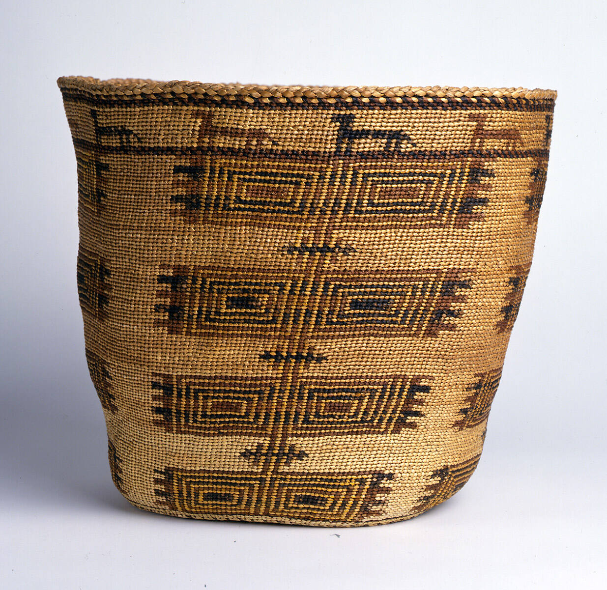 Label TextA branch of the Twana language family of the southern Coast Salish region, the Skokomish are neighbors to the Lushootseed (or speakers of Puget Salish) and the S'Klallam bands of Straits Salish speakers. Skokomish women of the late 19th and early 20th centuries are renowned as the weavers of fine, soft-twined storage and burden baskets embellished with often-complex geometric designs in reddish-brown and black on a neutral grass ground. Vertically-stacked repeating designs like this one are frequently seen, produced in a technique known as overlay twining, and have been identified as "boxes" or "fishnets" by the weavers themselves. Diagonal design movements are also produced by Skokomish weavers on the structural grid of warp and weft elements. These soft-twined containers usually display rim-bands like this one of upright quadrupeds in alternating color tones. The downward-angled tails indicate wolves in the Skokomish and other Salish traditions. This example is average in size for such woven containers. The largest are as big as 18 inches or more in height or diameter, and the smallest can be as compact as a drinking cup.The strength and flexibility of the materials create a basket that is soft and resilient, ideal for containing all kinds of dry material substances from foodstuffs to the raw materials of other arts, such as the mountain goat or dog's wool used in the spinning and weaving of traditional Coast Salish blankets. Skokomish weavers also made the firm, coiled type of baskets that were the hallmarks of Puget Sound, Straits, and Fraser River peoples. Created by stitching coils of cedar root bundles together in a spiral progression outward from the center bottom, the designs on these surfaces are made by the imbrication of grass, cherry bark, or horsetail root bark into the rows of cedar root stitching. The Skokomish coiled baskets also often feature an upper border of wolves or dogs (the latter indicated by their upward-curled tails) like their twined counterparts, and frequently display diagonal patterns related to the chip-carved zig-zag designs of the Columbia River and other traditions. (From the Catalog of the Thaw Collection of American Indian Art, 2nd ed.)