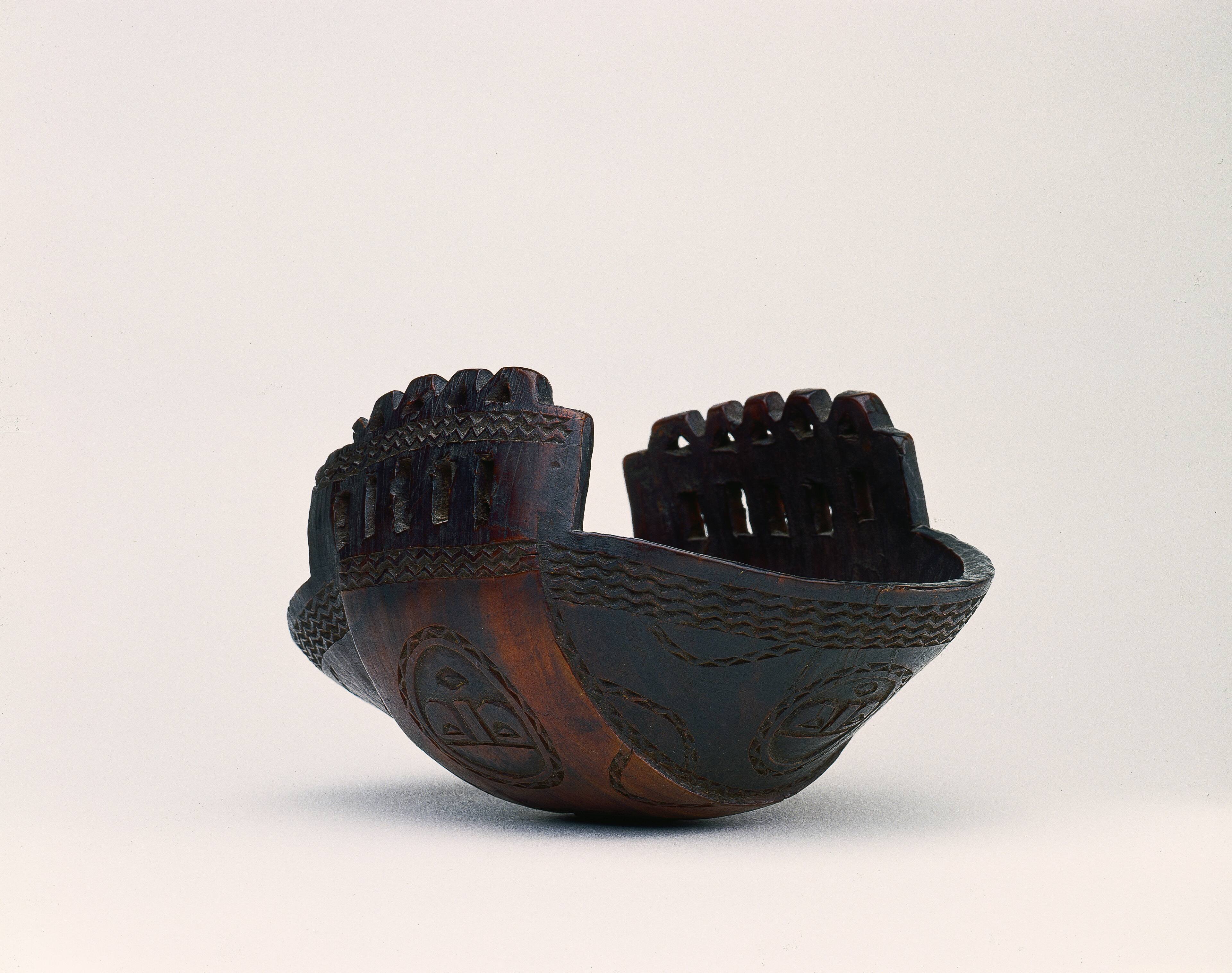 Label TextThe chip-carved zigzag lines on this sheep horn bowl reflect the ancient geometric design style of southern Northwest Coast cultures near the Lower Columbia River. The chip carving also frames several stylized human-like faces that may represent guardian spirits related to annual root-gathering rituals. The faces are geometric, with straight lines defining the brow and nose, a pointed oval representing the mouth, and half-circles for the eyes.Exhibition History"Art of the American Indian: The Thaw Collection," The Cleveland Museum of Art, Cleveland, OH, March 2, 2010 - May 30, 2010; Minneapolis Museum of Art, Minneapolis, MN, October 24, 2010 - January 9, 2011; Dallas Museum of Art, Dallas, TX, April 24, 2011 - September 23, 2011; Indianapolis Museum of Art, Indianapolis, IN, December 4, 2011 - February 12, 2012.