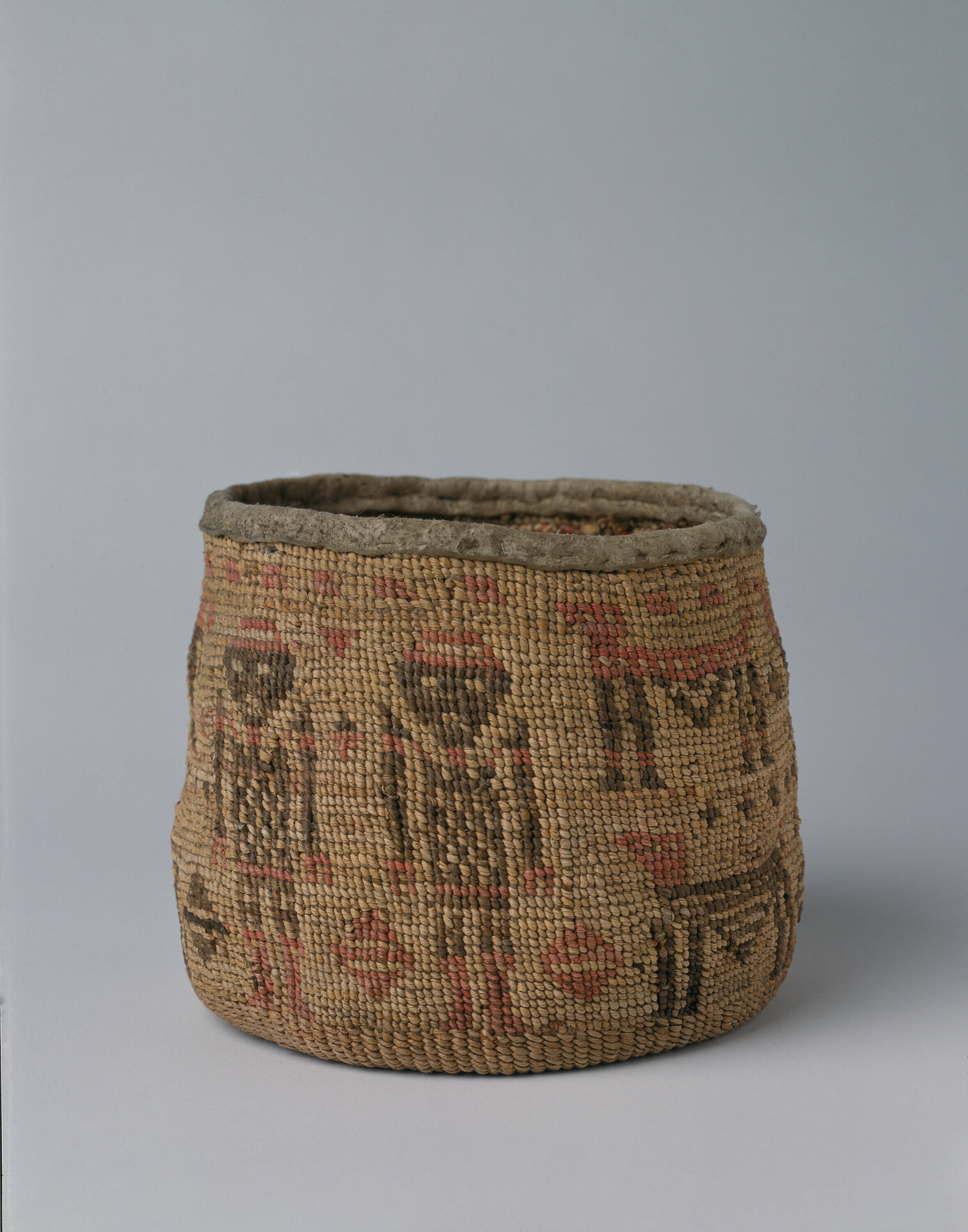 Label TextThe reverent gathering of vegetable food resources, such as the varieties of native roots that grow in the volcanic soils of the plateau region, has been an annual observance by interior peoples for thousands of years. Fragments of twined basketry dated at 9000 years old have been recovered archaeologically near The Dalles (Cressman et. al., 1960, p. 73) (Schlick/Duncan 1991, p. 37). Traditional communities today continue to observe these important annual ceremonies. Small, cylindrical pouches such as this were woven in part to serve as the receptacles for the ritual harvests of a large variety of native roots, including cous, camas, bitteroot and others. Decorated by overlay twining with the images of animals, spirits, and other representations, bags like these may have been carried by those leaders of Root Societies whose position it was to collect the year's first resources. Gently curved, T-shaped digging sticks (known as "kapin" in the Yakima language and still in use today) are the tools employed to loosen the root bulbs and tuberous growth from the soil. Ritual blessings and thanks to the earth spirits would be given at these special root feasts, where the first ceremonial harvests would be shared by the community. Larger hemp and corn husk bags also made on the plateau would hold the gatherings intended for drying and storage for the family's yearly supply.Bags such as this one display a wide range of images, which are created by the kinds of geometric lines that are common to all methods of design representation in the Columbia River area, regardless of medium. The human figures shown here differ little in conception and structure from ones that are carved in relief in either wood or horn, bone or antler (c.f. Holm 1983c, pp. 34-36). If the raised tails of the quadrupeds shown here relate to the historic Salish tradition (see fig. XX)[T153], the figures represent dogs, certain species of which were kept in part for the use of their fine, woolly hair. These stiffly geometric versions in red and black are very unusual in that their faces are totally frontal in attitude, their two eyes and pointed ears represented in the simple stitches of overlaid hemp and grass yarns. The use of red color, not a dye native to the area, suggests that this bag was made after increased trade brought new resources into the weaver's hands.