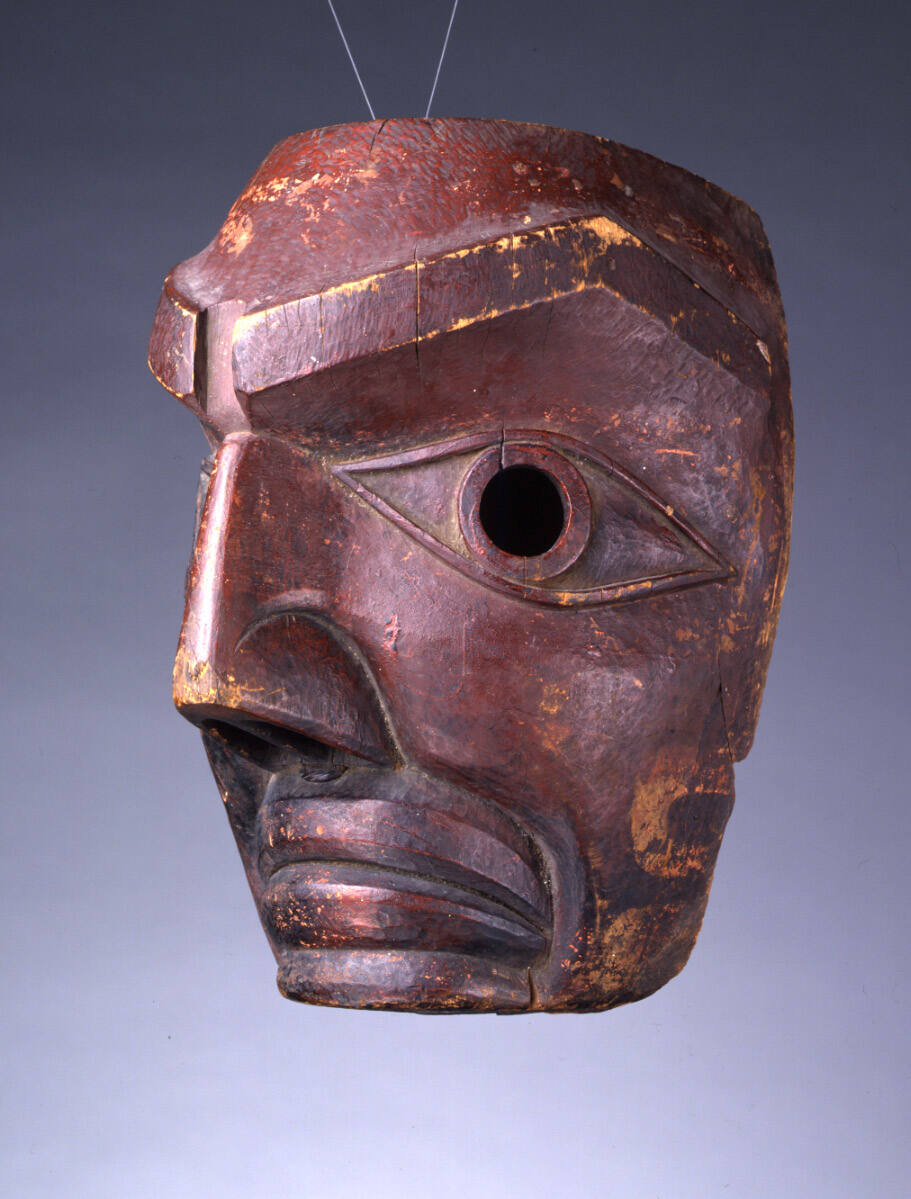 Label TextMakah and Nuu-chah-nulth artists of the historic period evolved a sculptural style with a unique conceptual dynamic. Beginning in the mid-19th century, certain masks were carved as if they were folded or bent on a centerline following the bridge of the nose, creating a deep overall dimension and a form that has been called prismatic (Holm1972). This mask is a classic example of this sculptural innovation. The brow line forms a major sculptural break that drops back to the cheek/eyesocket level, and the eyes are relief-carved on the surface of the major facial plane. A deeply-carved crease allows for the rounding of the lower cheek area and separates it from the lips and mouth. Set well back from the point of the nose, the lips curve around the conceptual bend in the face and are pushed back into the crease at the base of the cheek bulge.Many Makah and Nuu-chah-nulth artists of the 19th century have employed this underlying approach to the human face, and have shaped the eyebrows, eyes, nostrils, mouth and chin in their own stylistic fashions. Each mask carved within this style, as revealed in the carved features, the character of the face and the painted surface, is the unique creation of an individual artist. The sculptural style described here is like the shape or nature of the background canvas on which an artist paints their own style of picture. In addition to the particular representation of the eyes and other facial features in this mask, its maker originally painted the curving planes of the face with designs drawn from the two-dimensional tradition of the area. These have worn and faded over time while the wood darkened, effectively reducing the contrast of the original design. A surface over-painting was applied at some point long ago, perhaps to brighten up the mask or to alter its perceived identity.