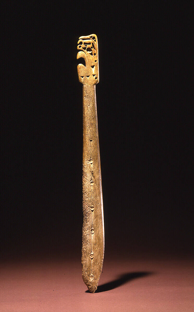Label TextWhaling, a highly revered and sacred endeavor, was fraught with danger. A weapon made from the jawbone of a whale, an animal that evoked so many powerful associations, likely empowered warriors with additional protection. This club’s elaborately carved pommel depicts a bird holding a small animal. The imagery is similar to that on early clubs.ProvenanceCharles Miles, Berkeley, California; Samuel Hubbard, Alaska; Taylor A. Dale, Santa Fe, New Mexico