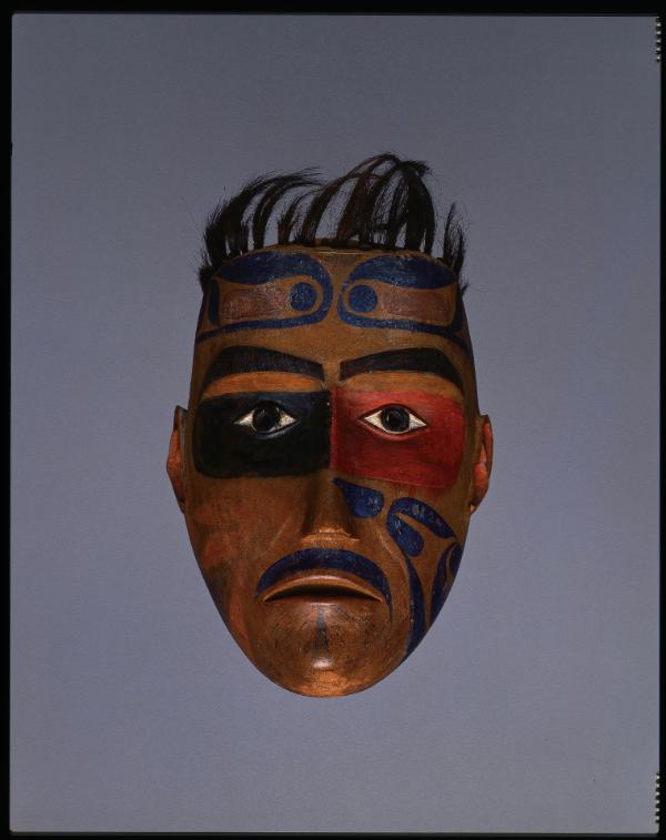 Label TextThe mask has a bite plug attached inside the upper lip, which the dancer bit down on to hold the mask in place. The plug allowed him to quickly don and off the mask to change from his own identity to that of the mask. The symbolism behind this mask painted designs is not readily apparent, but the black-and red-painted eye sockets bear at least a superficial relationship to the historic and contemporary Coast Salish smokehouse traditions, where the face paint of the participant dancers is either black or red depending on the details of their initiations.Exhibition History"The 45th Annual Winter Antique Show," New York, NY, January 12, 1999 – January 25, 1999.