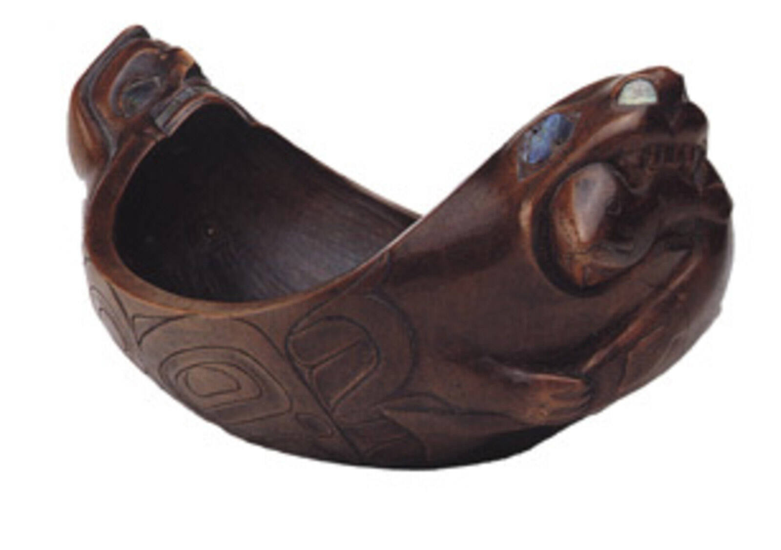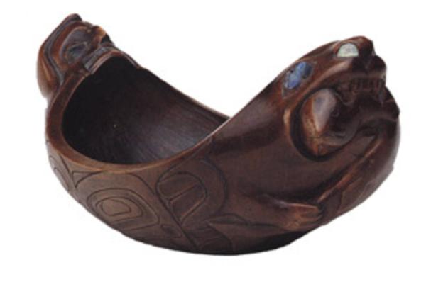 Label TextThe carver of this bowl added playful vitality to the form by creating an upswept sense of movement in the seal’s head and tail. The seal’s face is a blend of graceful naturalism and precision in its careful execution and inlay. Perhaps originally made for sale, skilled artists produced fine works to be sold or given as prestigious gifts to visitors. The presence of this new trade stimulated the expansion and embellishment of traditional forms. The process continues among contemporary Native artists today, with some creating unique new forms inspired by the earlier traditions.ProvenanceGeorge Terasaki, New York City