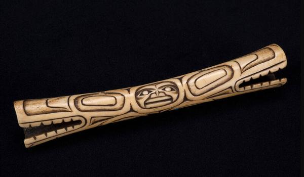 Label TextThe descriptive English name soul catcher has been applied to these gracefully balanced shaman's tools, said to be employed to contain the lost souls of people the shaman has been charged with healing. Shamanic healing focuses on the spiritual cause of symptoms and illness, rather than on the symptoms themselves as is the case in scientific medicine. The cause might be spirit possession, or the patient's own soul may have been influenced by witchcraft and become out of balance with the physical body. The shaman's task would be to recover that 'lost' soul and return the patient's spiritual well-being, after which the physical symptoms would be overcome by the body's revitalized defenses.Deeply engraved and completely encircling the tapering bone tube, the designs of soul catchers most frequently follow this conceptual model. The ends of the symmetrically-chosen bone section (bear's leg bone fills the bill, but some other source including wood and goat horn are known to have been used) are adapted to portray the open mouths of creatures which vary in appearance from wolves and bears to whales. The clan tradition of the owner may influence the emblems contained thereon, or they may be selected by the shaman from among his spirit helpers, who could dwell in either the sea, land, or air. Without nostrils or obvious ears, the heads depicted here may represent those of whales or other sea mammals. It is very common on these objects to see a humanoid face in the middle of the composition, which could in fact symbolize the captured spirit, safely held within and protected by the fierce creatures carved so firmly into the bone surface. Some soul catchers include blue-green abalone inlays, carefully cut and fit into the surface, which sometimes goes missing, but this one appears not to have been embellished in that fashion. (From the Catalog of the Thaw Collection of American Indian Art, 2nd ed.)