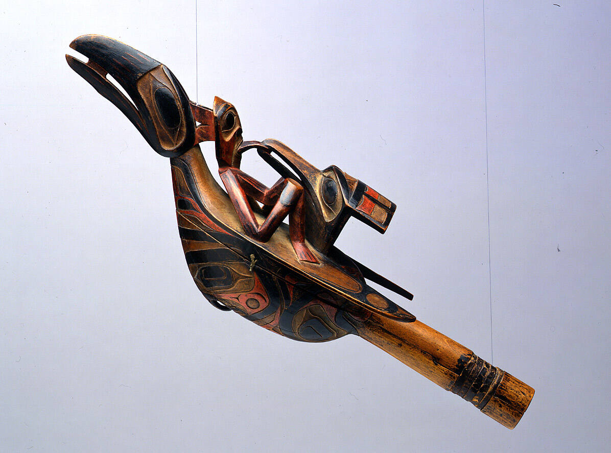 Label TextThe raven rattle is one of the major archetypes of Northwest Coast cultures, a master’s study in carving and spiritual symbolism. Raven is the creator-spirit who gained the privilege of playing with the box that held the sun, moon, and stars. These he released to humankind and the world was given light for the first time.ProvenanceJulius Carlebach, New York City, about 1964; George Terasaki, New York City; Stefan Edlis, Chicago, Illinois
