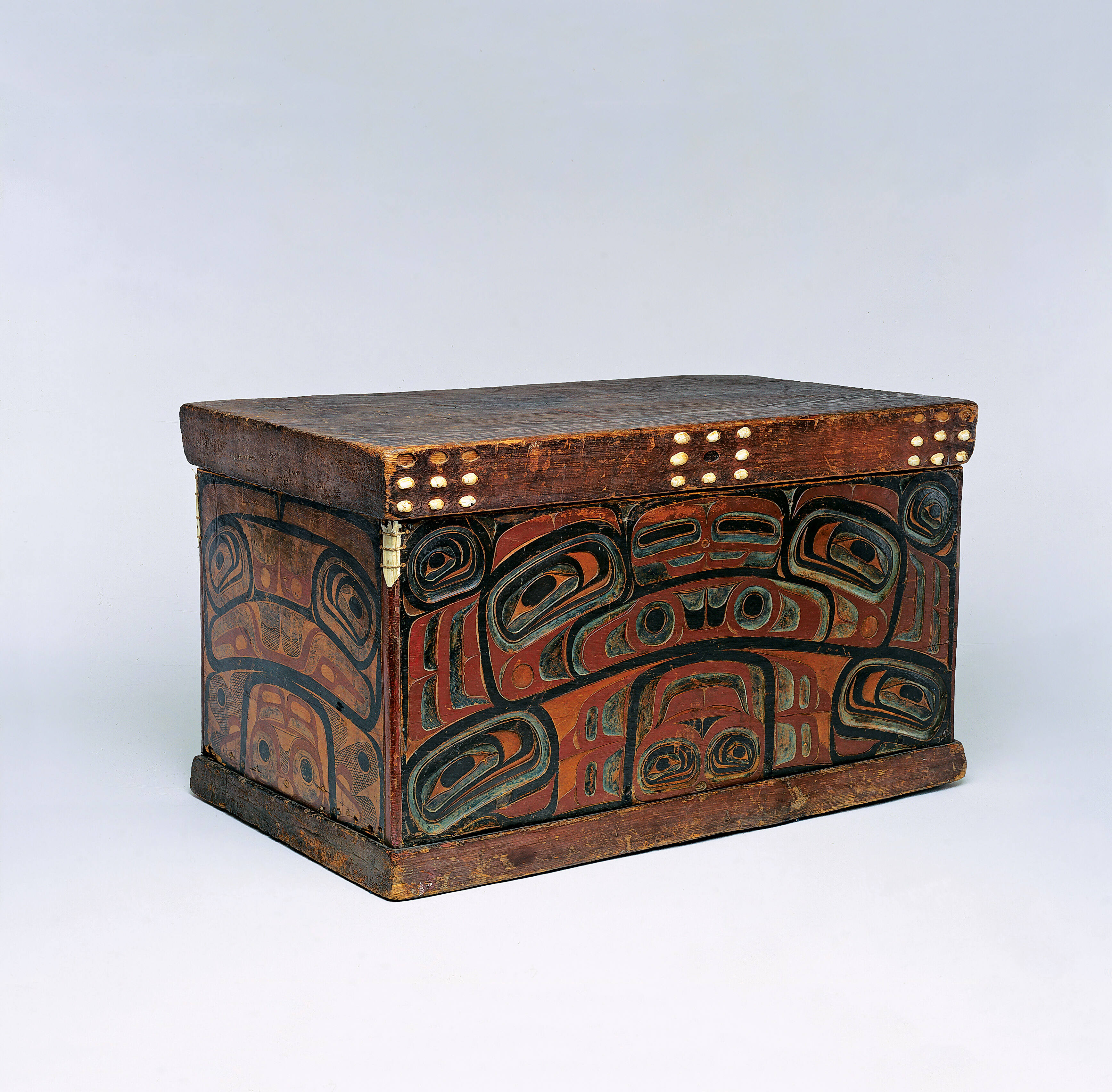 Label TextHighly esteemed objects like decorated bowls, boxes, and carved chests are known to have moved great distances between coastal First Nations as documented by examples such as this and at least one of its relatives. Without the details of its story to inform us, only its appearance reveals that it was made in Haida Gwaii (Queen Charlotte Islands). Acquired by Alton L. Dickerman in the Baranov Island town of Sitka, Alaska, about 1883, the chest would have traveled over two hundred and fifty miles between there and its origin, to have arrived some unknown number of months, or years, or decades before its, acquisition. The similarity of its design style to other chests known to have been Haida-made is best established by comparison to a particular chest also collected from Tlingit owners (c.f. Holm 1987, p.148, fig. 58). That heirloom container of Tlingit clan treasures belonged to the Gaanaxteidi clan Whale House, of Klukwan, Alaska. It was photographed in the original Whale House by Juneau photographers Lloyd Winter and Percy Pond in 1895, as well as others. The house master, named Coudahwot (G.T. Emmons' spelling), informed Lt. Emmons on the occasion of the sale of the chest (before 1905) that it had been acquired by the Gaanaxteidi in trade from the Haida of Haida Gwaii (over four hundred miles to the south). Close analysis of the two-dimensional decoration on the Klukwan chest discloses a direct relationship to the painting and relief-carving of the chest illustrated here from the Thaw collection, originally purchased in Sitka some twenty years prior to Emmon's acquisition.Both objects reveal the work of a master designer and carver, who balanced forms and spaces so efficiently that each of these complex, three-color painted images appears to be in a perfect equilibrium between movement and stillness, power and calm. Examination of many subtle details of each design serves to underscore their common heritage: not only made by the same hands, but probably also about the same time. Each smoothly-integrated formline design is completely different in overall pattern, but each U-shape, ovoid, nose, tongue, and eye shape match so closely in form and style that it's almost as if the two chests were made back to back. Even the specific red, black, and blue-green paint colors appear to be the same hues, fairly unusual in a medium where natural variation is the norm.