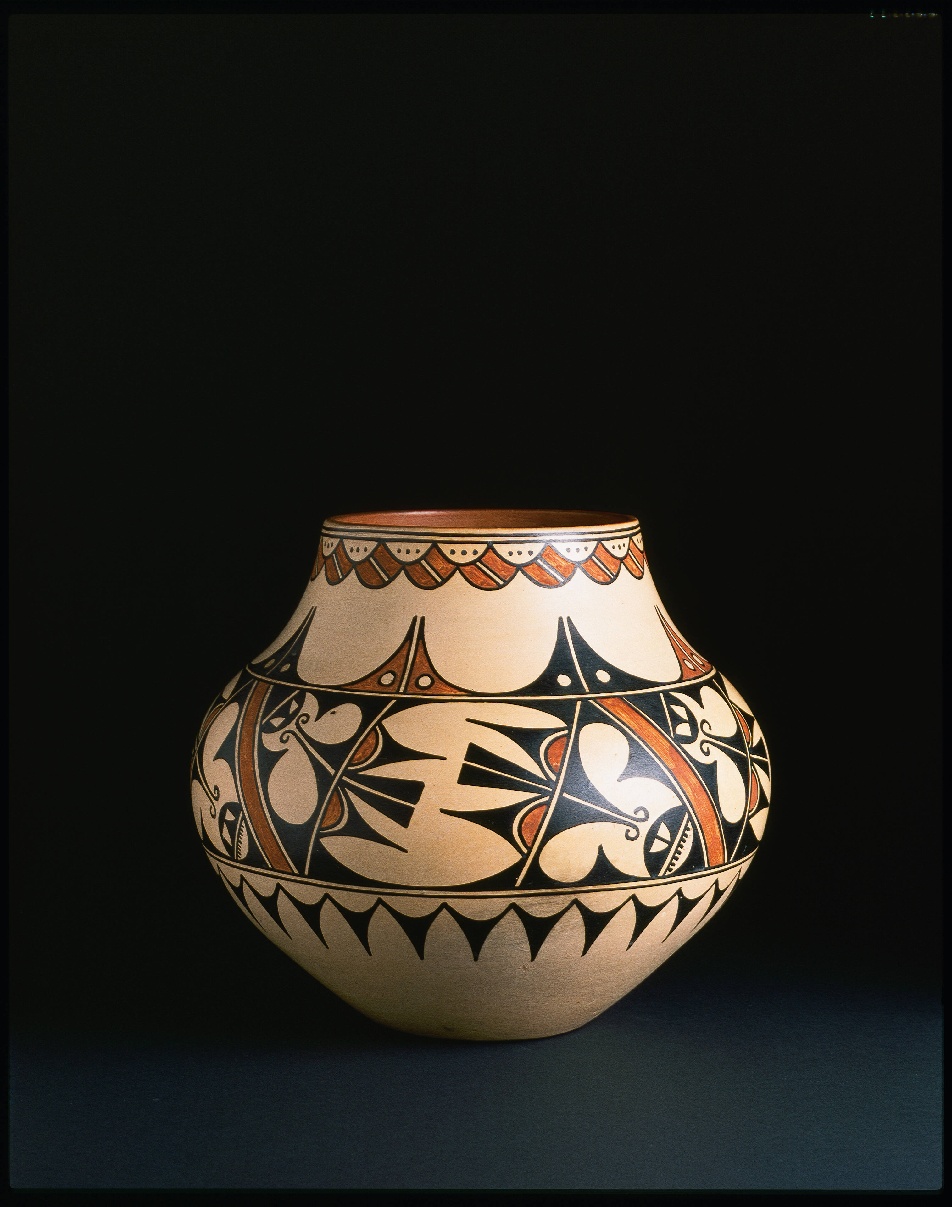 Label TextMaria Martinez formed clay into vessels and her husband Julian painted designs on some of her finished pots. The combination of Maria’s expertly formed and burnished vessels and Julian’s elegant designs brought the couple great acclaim. Their success inspired other potters and was a strong influence in the revival of pottery traditions in the pueblos. Around 1925 Maria gave this polychrome jar to Dr. Lane, director of the Indian Hospital of the Santa Fe Indian School, for help extended to her family.Exhibition History"Art Des Indiens D'Amerique Du Nord Dans La Collection D'Eugene Thaw," Mona Bismarck Foundation, Paris, France, Somogy Editions D'Art, January 21, 2000 - March 18, 2000.