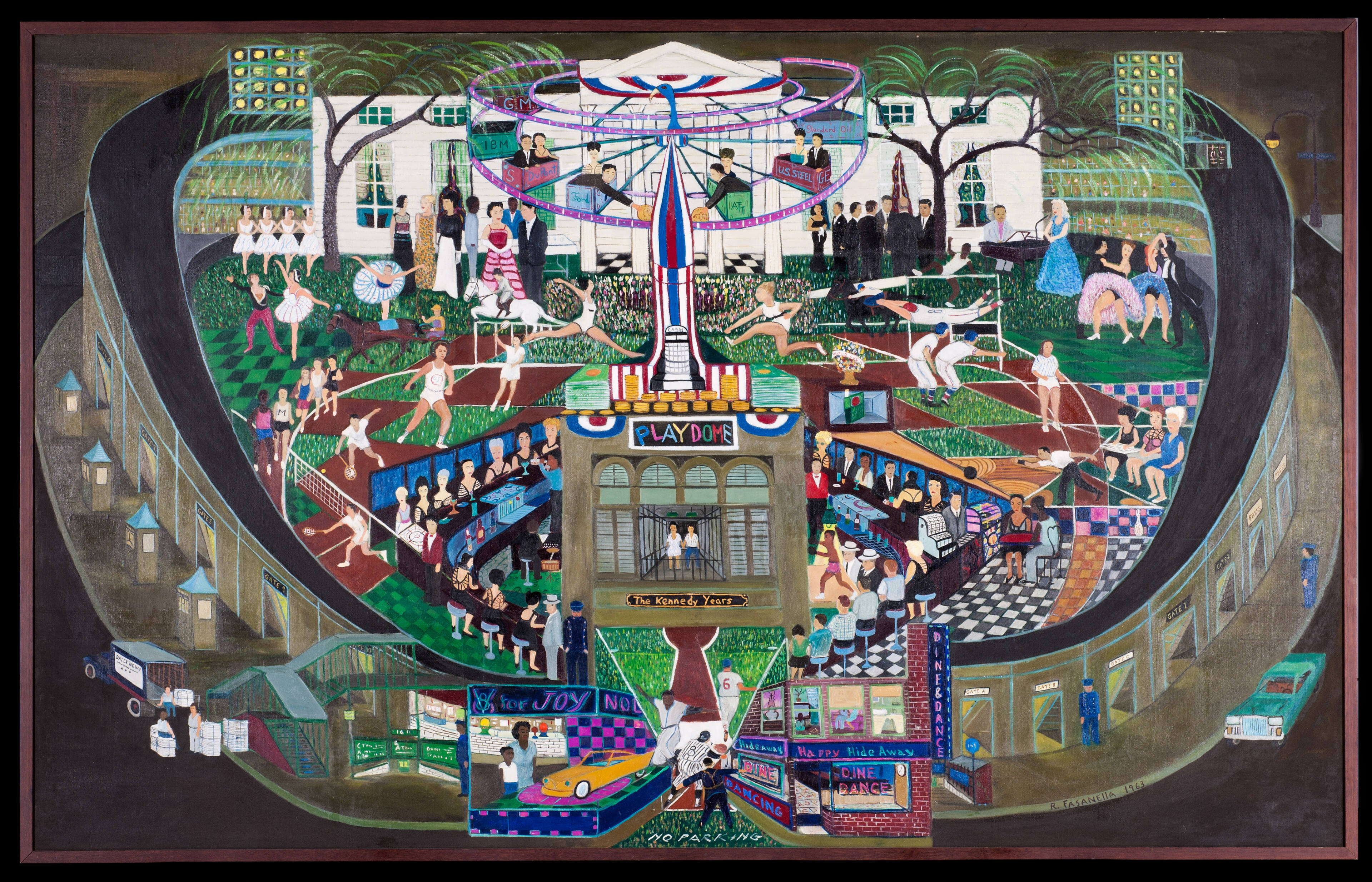 Label TextPlaydome is Fasanella’s reflections on the youthful exuberance of the Kennedy years. Using a sports stadium as a means of organizing the composition, the artist fills the space with a myriad of details including baseball, tennis, track and field, equestrian sports, ballet, and more. The backdrop of the White House features a garden party and an amusement park ride where corporate entities grab coins from a rocket. At the center of the image, Fasanella has placed Julius and Ethel Rosenberg (executed as Atomic spies in 1953) in their jail cell. The social and economic injustice felt by the artist and embodied in these last images, appear drowned out by the frantic distractions of the world around them.On View