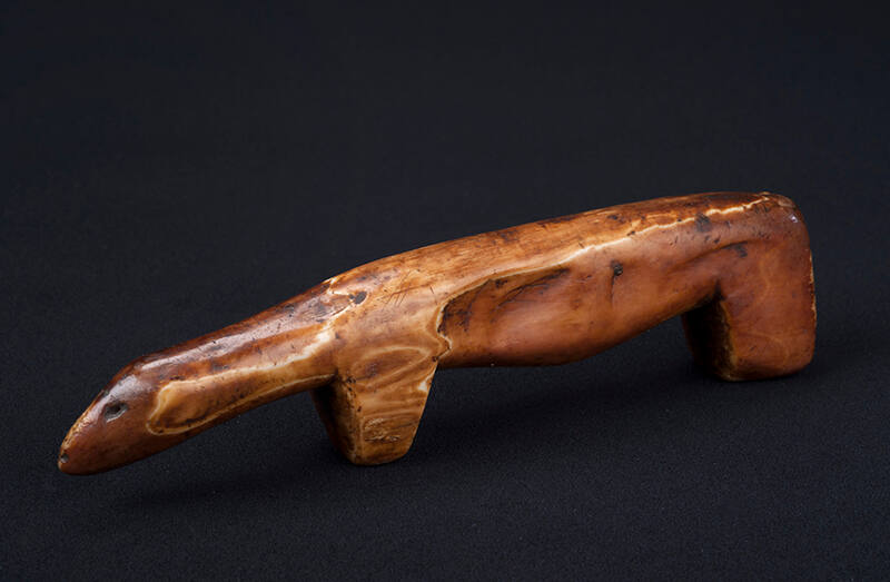 Label TextHunters carried small figures like this bear during the hunt to receive aid from the game spirits. The elongated body of the bear has little detail except for its eye markings. Its legs are solid masses with no joints or paws. The carver’s interests seemed to lie in creating a smoothly finished, yet powerful, bear.ProvenanceMillicent Rogers Museum, Taos, New Mexico; Larry Frank, Arroyo Hondo, New Mexico