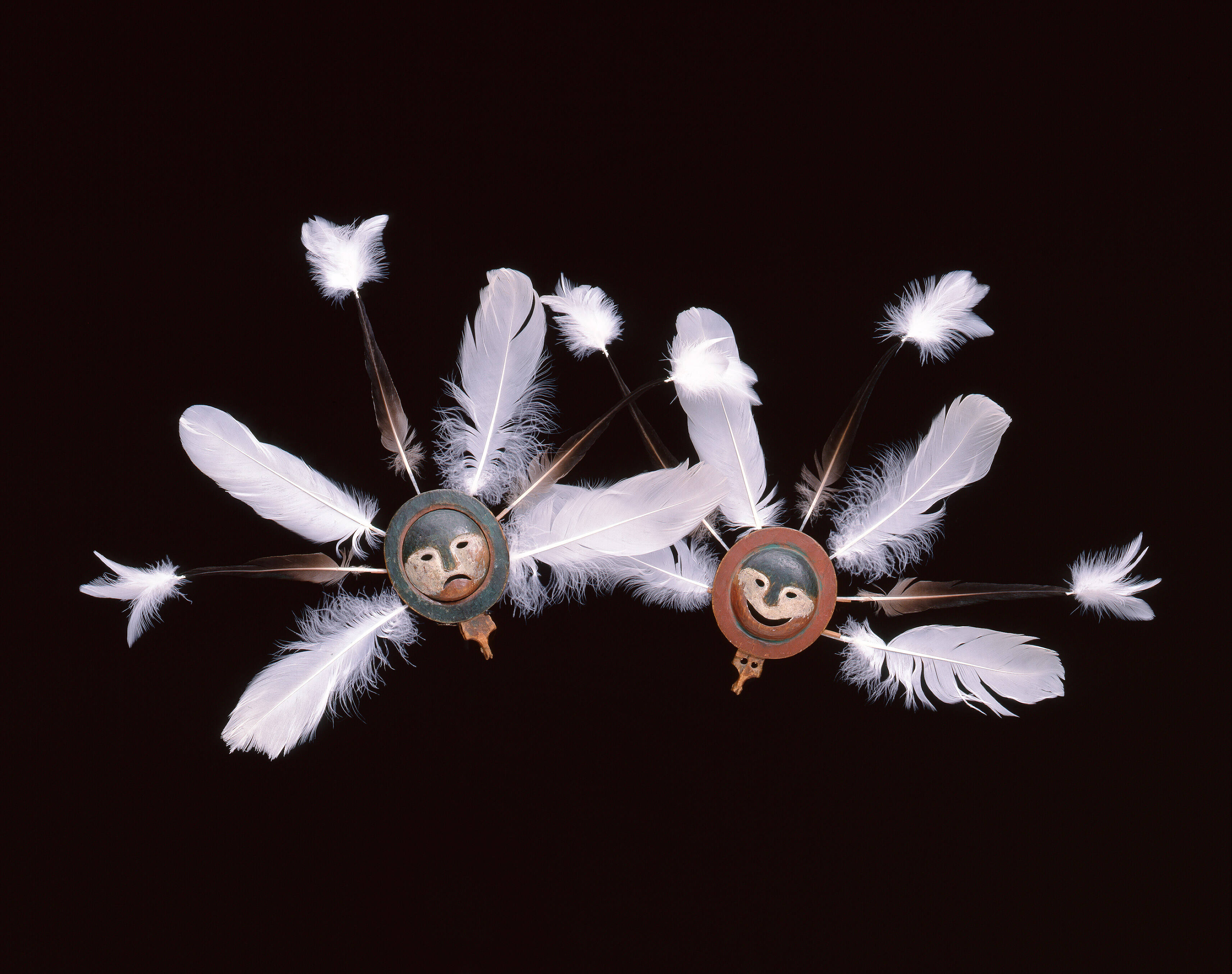 Label TextDance fans are usually danced as a pair. These two sets of dance fans also acted as rattles. The face on each fan lifts off to reveal a hollowed area. McIntyre placed small round beach pebbles inside the cavity to give the fans a voice. Both sets of dance fans have dark duck feathers to contrast with white elements – swan feather or caribou fur. This creates a contrast of dark and light elements, a reference of the fundamental duality of the universe. The numeric ordering of three duck tail feathers and four swan feathers (or sprays of caribou fur) have cosmological symbolism.Exhibition HistorySubstance of the Stars, Heard Museum, Pheonix, AZ, October 23, 2022 - April 23, 2024