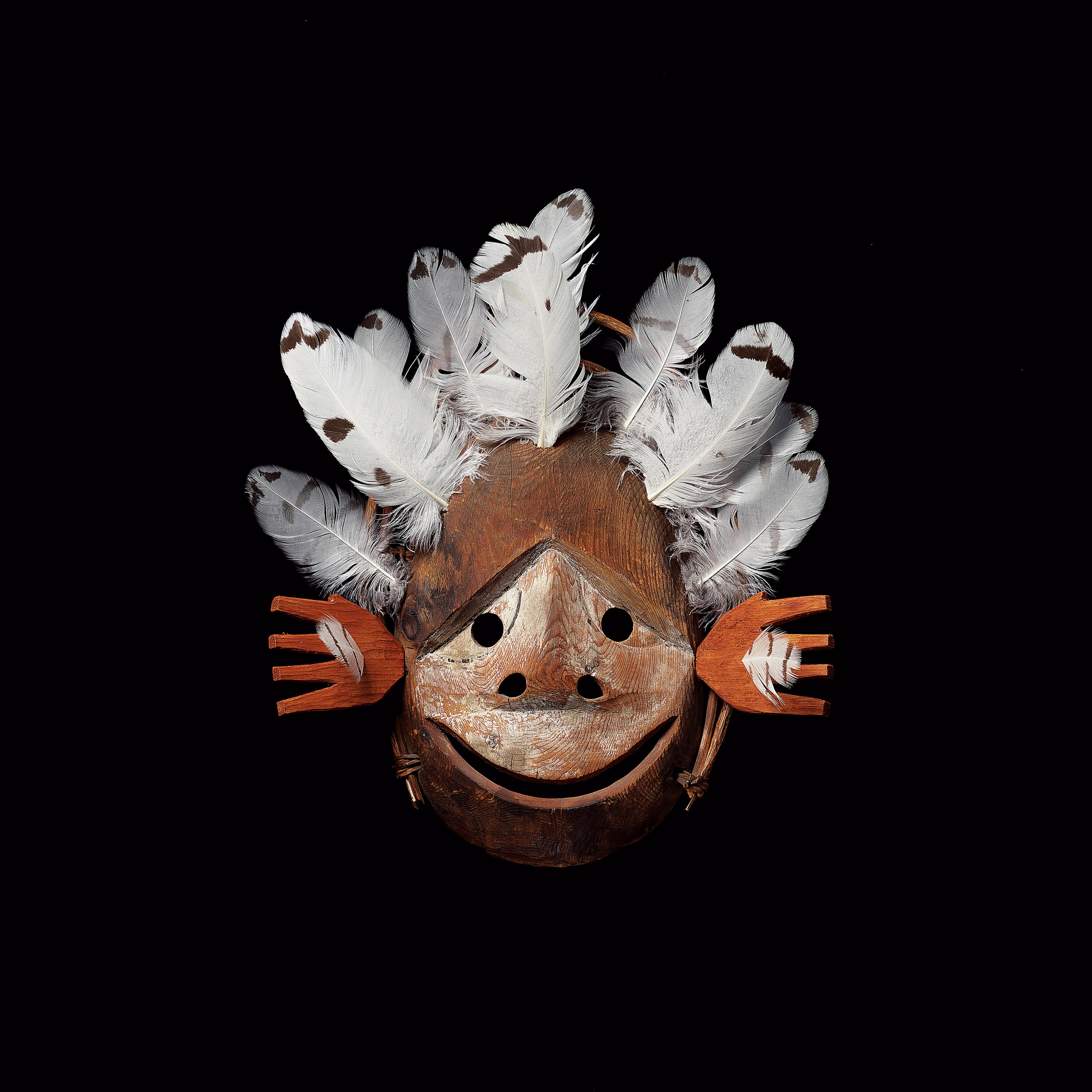 Label TextThis small mask needed an additional reed hoop, a pair of ochre-stained thumbless spirit hands and a double row of snowy owl feathers. The thumbless hands refer to the inability of the spirits to grasp and catch game animals thereby ensuring the availability of the hunt for the Central Yup’ik.ProvenanceSamuel Hubbard, Alaska; Charles Miles, Berkeley, California; John Malloy, New York City