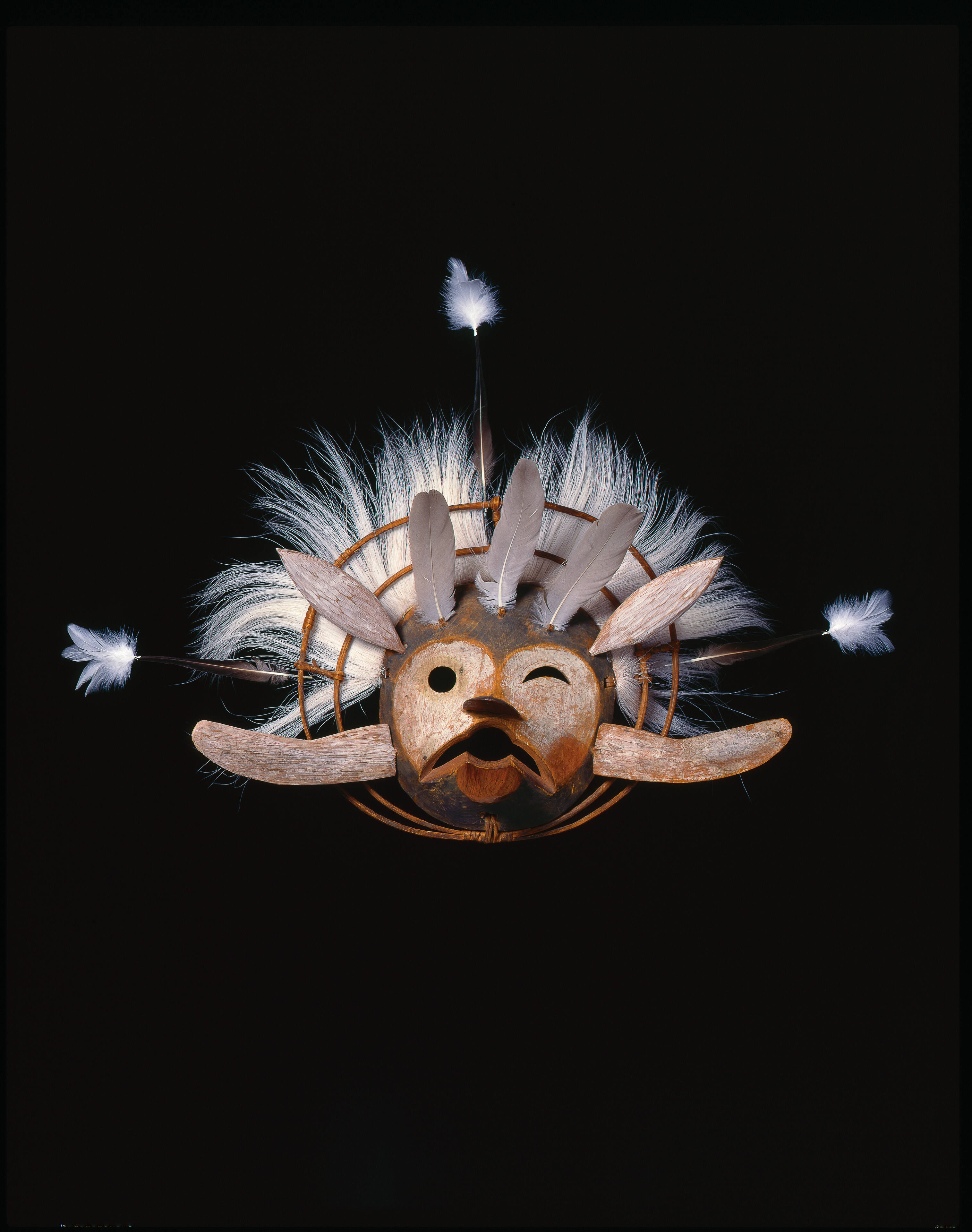 Label TextThe raven is of great importance in the spiritual beliefs of the Yup’ik people. Raven created the means for man to interact with nature and enabled him to prosper by providing food and teaching him to hunt. The raven is also a culture-hero trickster and a notorious shape shifter. The multiple wooden rings that encircle the mask signify the different levels of the universe.Exhibition History"Treasures from the Thaw Collection," Wheelwright Museum of American Indian Art. Santa Fe, NM, May 1, 2000 - December 31, 2000.