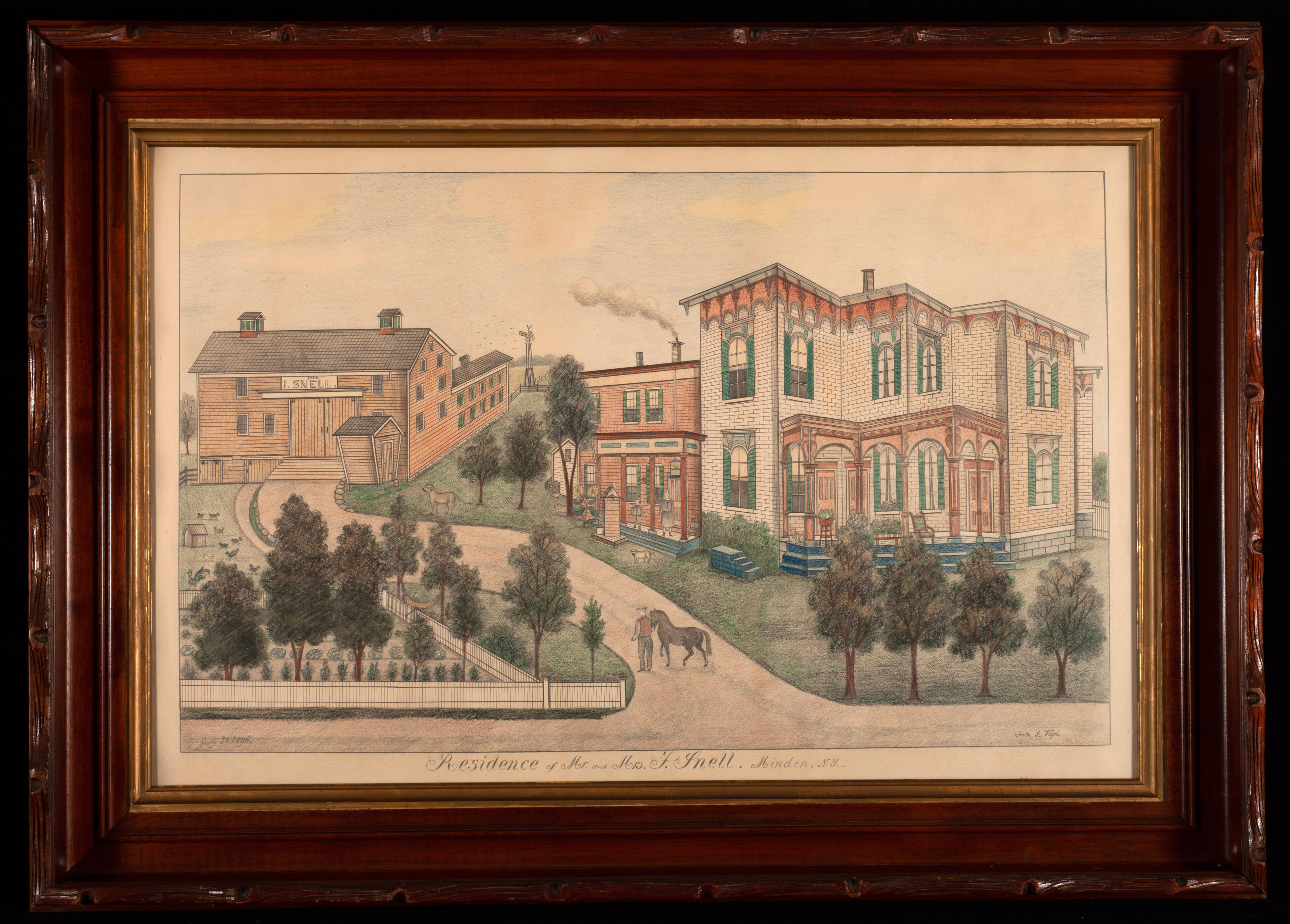The ornamental penmanship used by Fritz Vogt can be difficult to read today; the first name of Mr. Snell could begin with an I, f, J, S, or even a T. Adding to the confusion, Vogt included the sign above the barn door that clearly reads “I. Snell” along with the date “1866.” Census records do not list an “I. Snell” living in Minden in the 1800s or early 1900s. Vogt could have been using an old German penmanship or spelling where the letters I and J were similar. If so, Jacob Snell (1827-1896), a farmer or John O. Snell (1837-1917), a merchant, who both lived in Minden in the late 1800s, could be the Mr. Snell in this drawing.