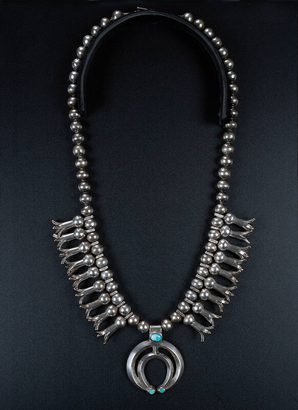 Label TextThis type of silver necklace, referred to as a squash blossom necklace, became a popular design form among Diné silversmiths in the late 19th century, and has continued in popularity among Diné and non-Natives alike.Exhibition HistoryArt Des Indiens D'Amerique Du Nord Dans La Collection D'Eugene Thaw, Mona Bismarck Foundation, Paris, France, Somogy Editions D'Art, January 21, 2000 - March 18, 2000.