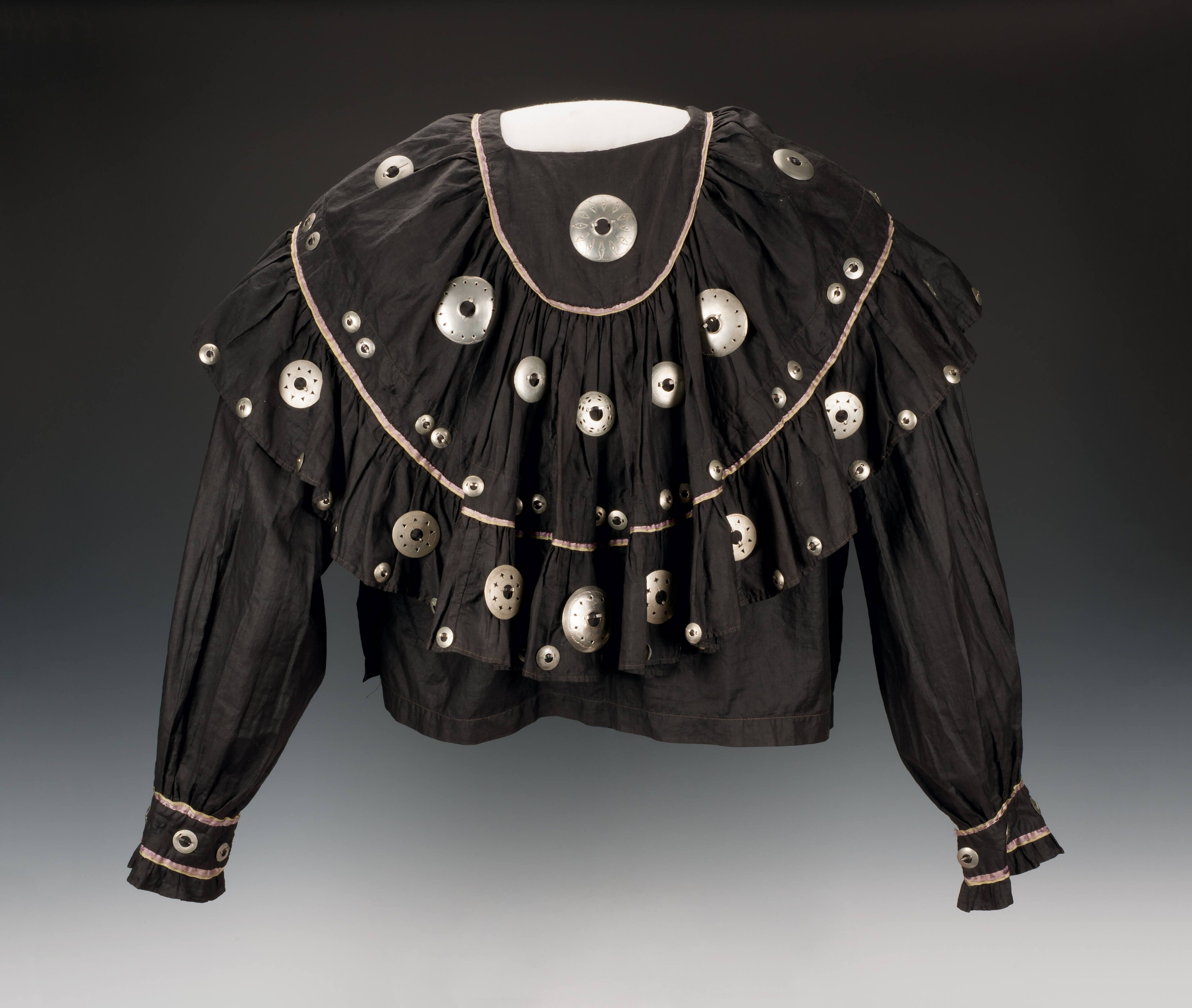 Label TextThis black cotton blouse, with its generous flounce, provides a decorative contrast for the profusion of shiny German silver brooches. Fine clothing communicated complex messages about gender, age, social status, beauty, spiritual and cultural affiliations. Additionally, hairstyle, jewelry, face and body, and piercing were equally important elements of dress.ProvenanceFifi White, Shawnee Mission, Kansas; Jonathan Holstein, Cazenovia, New York