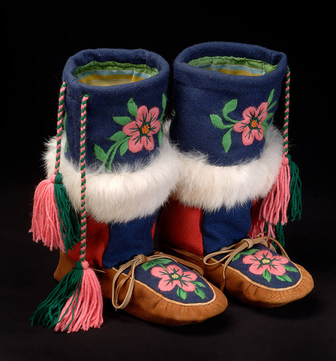 MediumTanned and smoked moosehide, rabbit fur, wool duffle, wool yarn, thread, printed cotton fabric