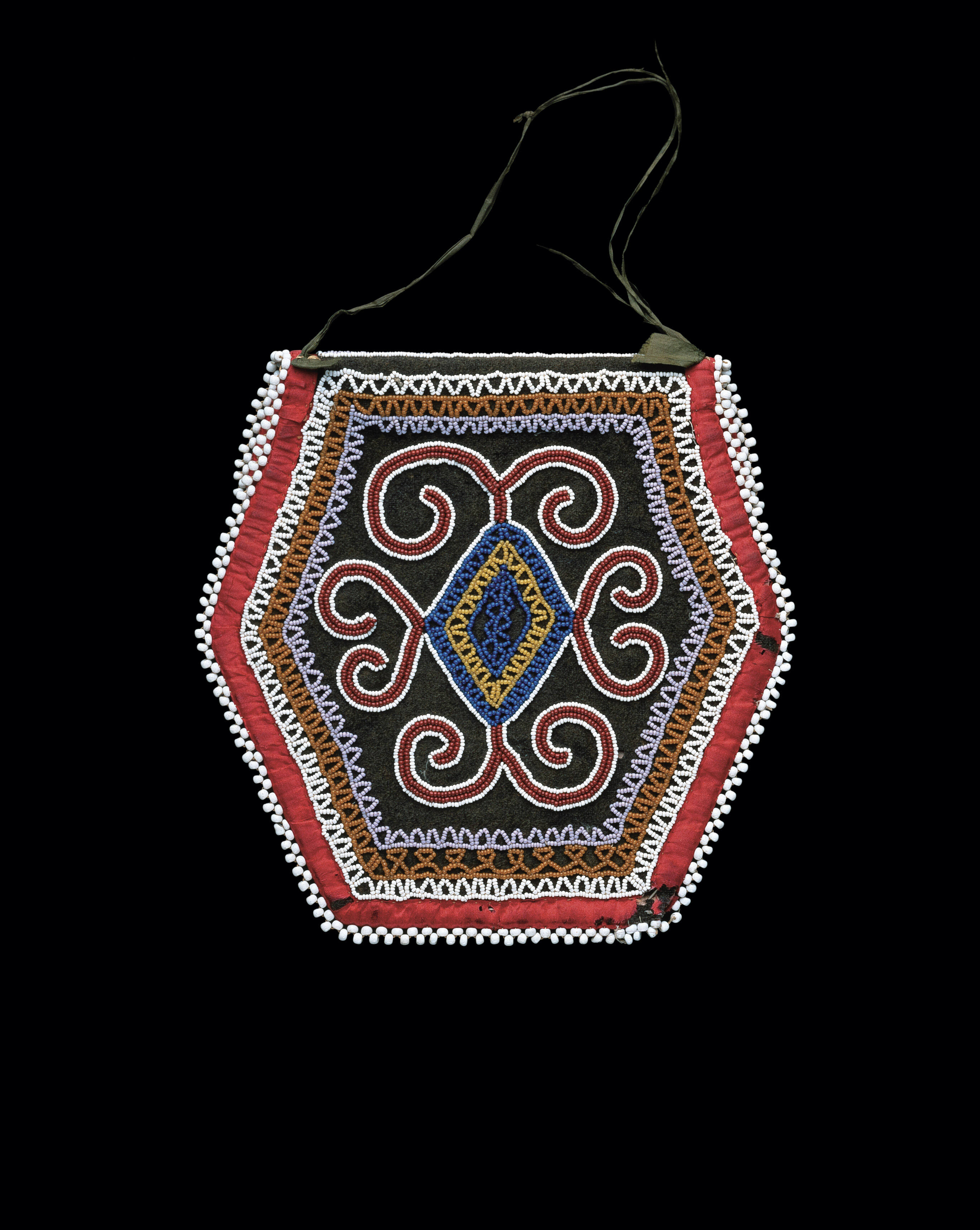 Label TextThis finely beaded bag has cosmological symbolism in its design. The curved elements radiating from the central diamond relate to the four cardinal directions of the universe. The central diamond symbolizes the centre of the universe, or the opening in the sky through which Sky Woman fell. Haudenosaunee women began to make beaded bags for sale to travellers and tourists around 1800. Some of these bags may have been used for medicinal purposes among the Haudenosaunee.Exhibition History"Art Des Indiens D'Amerique Du Nord Dans La Collection D'Eugene Thaw," Mona Bismarck Foundation, Paris, France, Somogy Editions D'Art, January 21, 2000 - March 18, 2000.