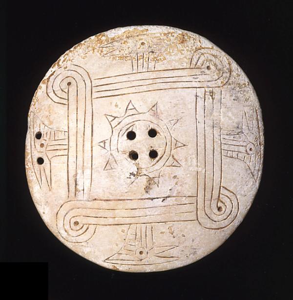 Label TextEngraved on this Cox Mound-style shell gorget is one of the most important symbolic designs in the Mississippian Ritual. Other similarly engraved gorgets have been found in northern Mississippi, Alabama, and Tennessee. The design is a combination of three motifs, which also occur separately. It consists of the cross-in-circle, surrounded by the looped square, from the four sides of which project the heads of four crested birds.The cross-in-circle represents the sacred fire, maintained by four logs placed crosswise in the center of the ceremonial plaza or on top of a temple mound in the major towns of the Southeastern nations.