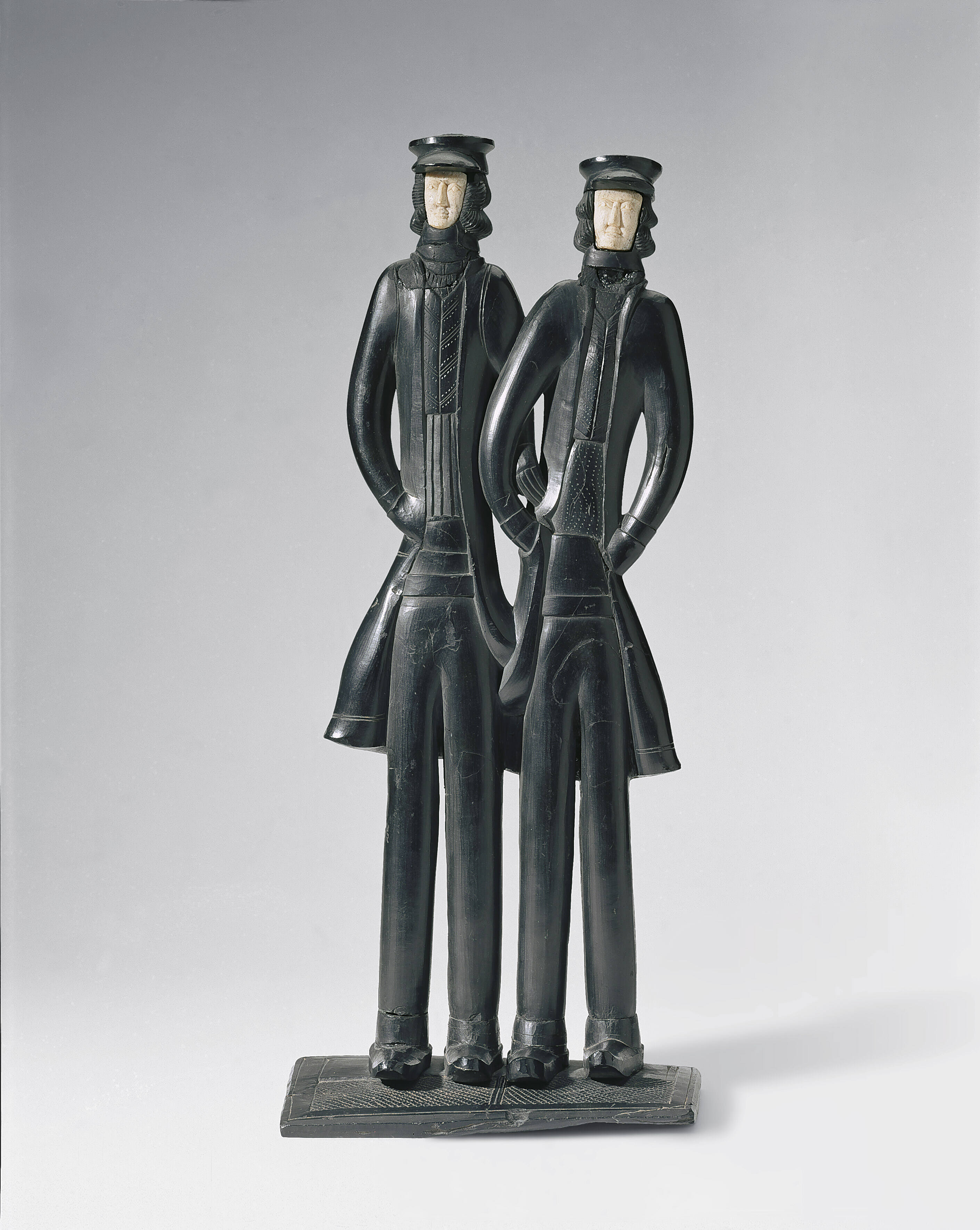 Many of these naturalist figures appear very formal: captains in long coats, with a serious look on their faces and hands in their pockets. Others are more humorous or whimsical in nature, but perhaps none so much as this pair of animated caricatures. The usual attention has been paid by the carver to the oddities (from a Haida perspective) of the sailors’ clothes and dressing style, depicting shoes, collars, cuffs, shirt or vest patterns, scarves, and hats. The men’s hair is wavy and long, flowing from cap to collar in 1840s style, and their fair-skinned faces have been detailed in small ivory pieces set in place below their hat brims. The facial expressions are curious, conveying a real personality for each of the two friends. Their posture and whimsical body language add to the magnetic quality of this sculpture representing Boston or King George’s men, as the unfathomable Americans and British were called by Northwest Coast First Peoples. (From the Catalog of the Thaw Collection of American Indian Art, 2nd ed.)