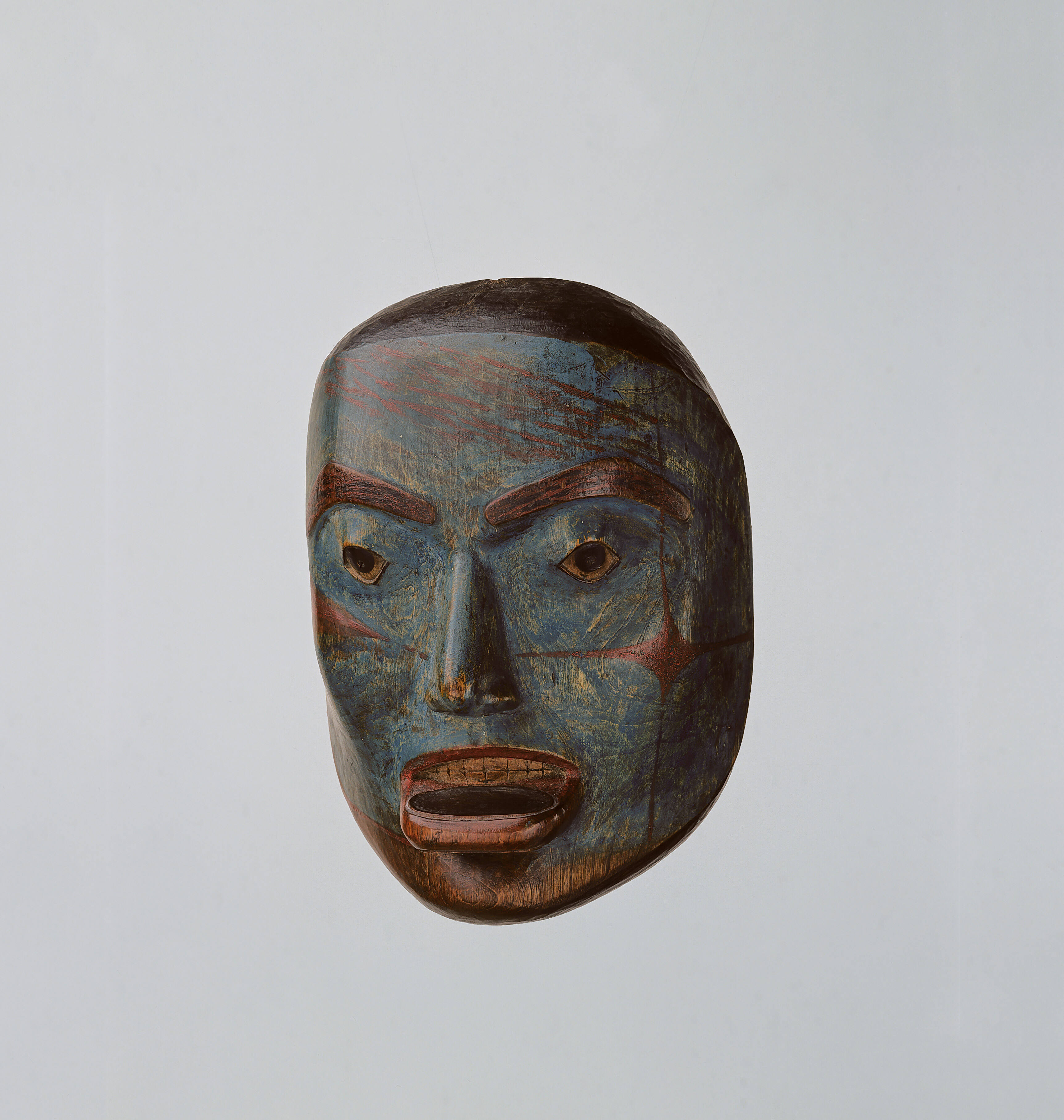 Label TextMost Tlingit masks were the property of shamans (known as Ixt' in Tlingit) and represented various spirits that assisted them in making cures, each with unique characteristics and painted facial designs. Lt. G.T. Emmons recorded the names of a great variety of nature spirits and spirits of human personalities who assist shamans in the manipulation of the spiritual influences that manifest illness in their patients. Once the interfering spirit-presence was found and removed or destroyed, the patient's own revitalized immune system would be able to recover to a balanced state. Other Tlingit face masks were made to represent people and animals that figured in mythology and clan history, and were used in performances of dance and drama.This finely-conceived mask appears to be of the shaman's spirit type, and is an early and expertly-made example. The lip plug or labret indicates a female personage of high social rank, and these wooden ornaments were worn by women of this stature up until the end of the 19th century. The facial paintings in blue and red are probably connected to the particular identity of this spirit-being, though the specific information apparently has not survived. The slightly raised eyebrows are painted red, overlaid with black dashing, which is an unusual combination in Tlingit work.