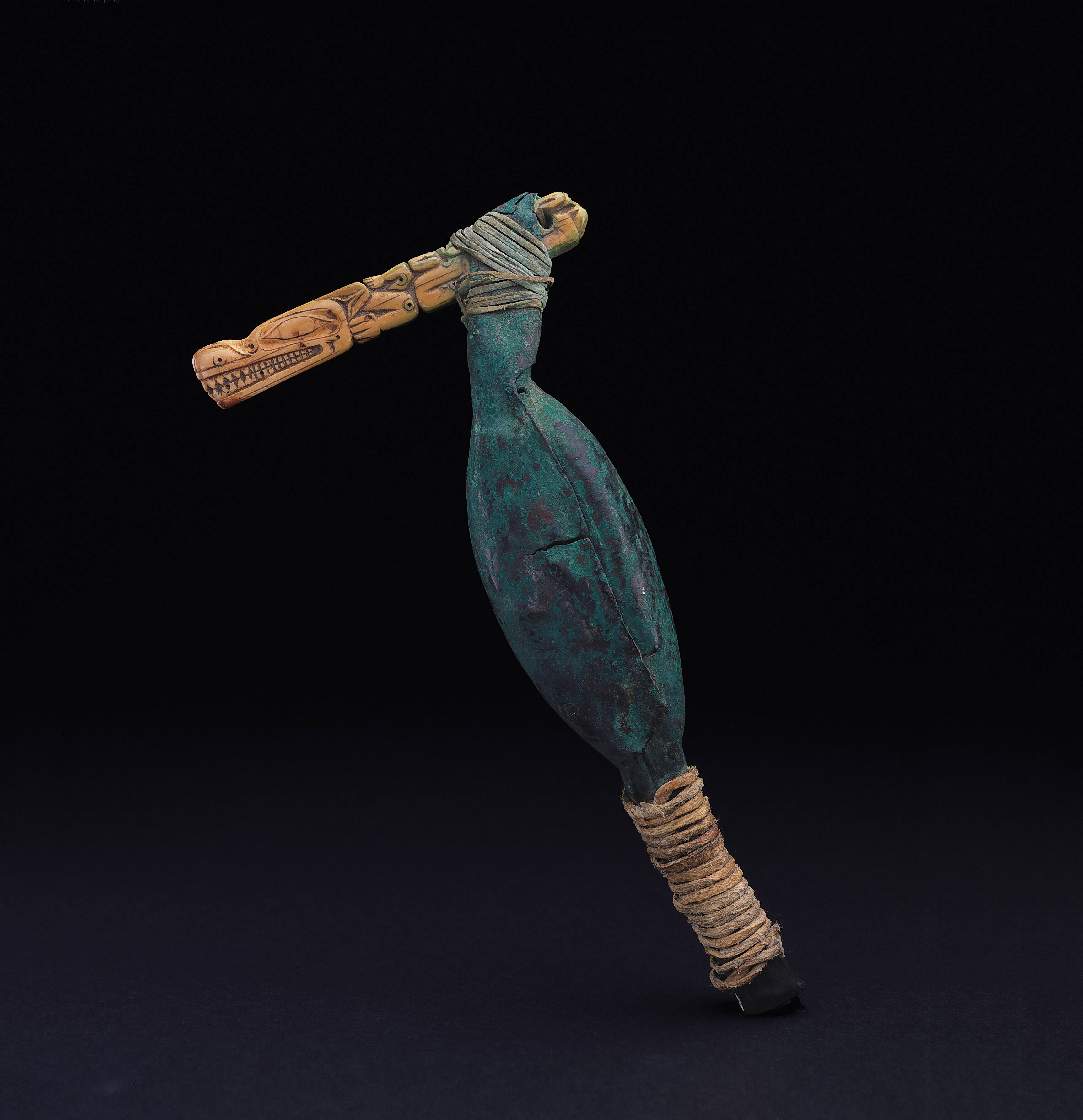 Label TextPerhaps the result of a particular shaman’s vision, this copper and ivory rattle is the only one of its kind. The form of the oystercatcher rattle has been imitated by a copper body with a carved ivory amulet forming the head and beak shape. The ivory amulet was probably once part of a full necklace used by a shaman, indicating that it has been adapted from a pervious use to complete the rattle.ProvenanceWolfgang Paalen, Mexico City, Mexico; Ralph Altman, Los Angeles, California; Taylor Museum (5108), Colorado Springs, Colorado, 1954