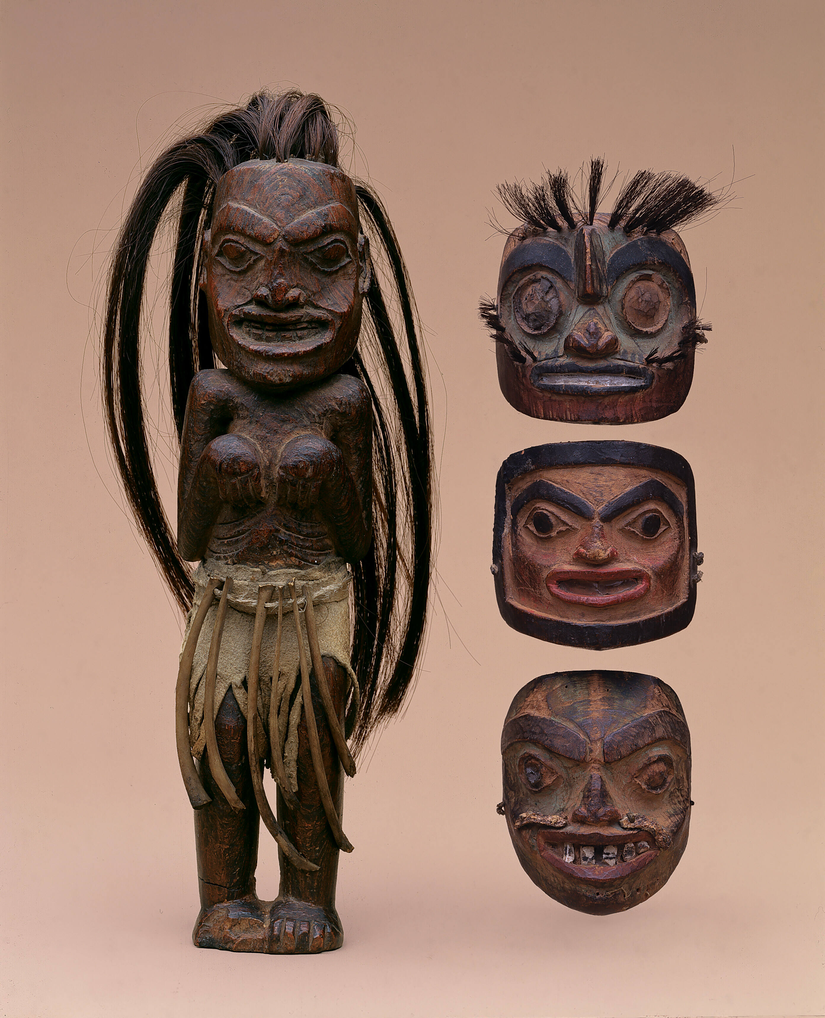 This expressive figure represents a shaman and several masks that aided him. His long unkempt hair was a source of shamanic power and a symbol of shamanic identity. His pawlike hands refer to his ability to transform between human and animal realities. The figure may have helped identify a patient's illness. The miniature masks represent spirit helpers.ProvenanceAlton L. Dickerman, collected in Sitka, Alaska, c. 1883; Miss Foster B. Dickerman, Colorado Springs, Colorado; Mrs. Alice Bemis Taylor, Colorado Springs, Colorado, 1928; Taylor Museum (4910; 4912; 4915; 4926), Colorado Springs, 1954