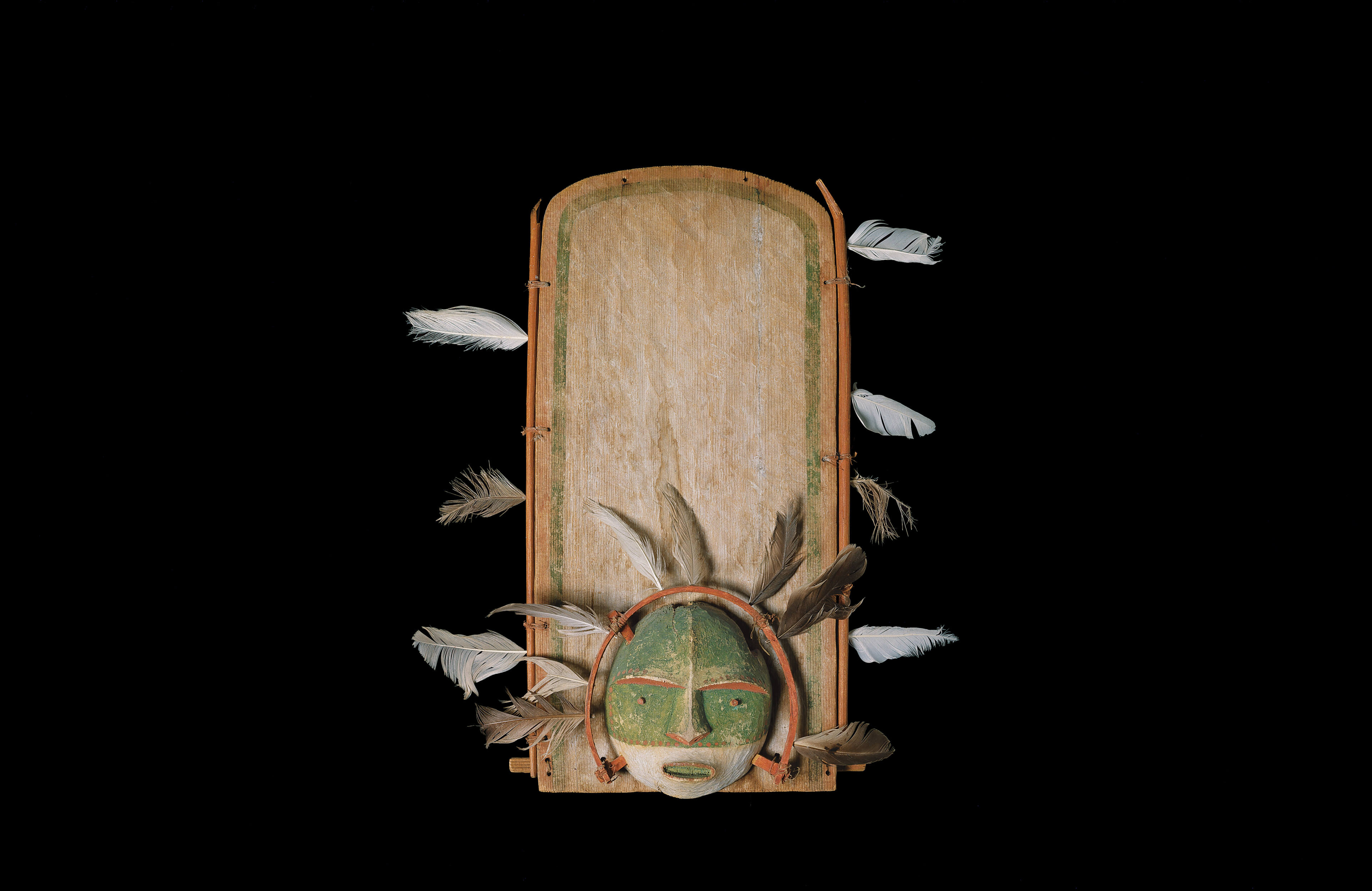 This important Koniag mask is similar in genre to the miniature carving with a serrated halo at the end of a Koniag hand drum's handle donated by Etholen to the National Museum of Finland, Helsinki, in 1846. A similar mas is in the collection of the Museum of Anthropolgy and Ethnology, St. Petersburg, Russia. The plank and hoops are more pronounced in the St. Petersburg example, and the face has horizontal rather than vertical striping. The hoops and the feathers relate to northern examples as well as to Aleut, but the delicacy of statement is pure Koniag.