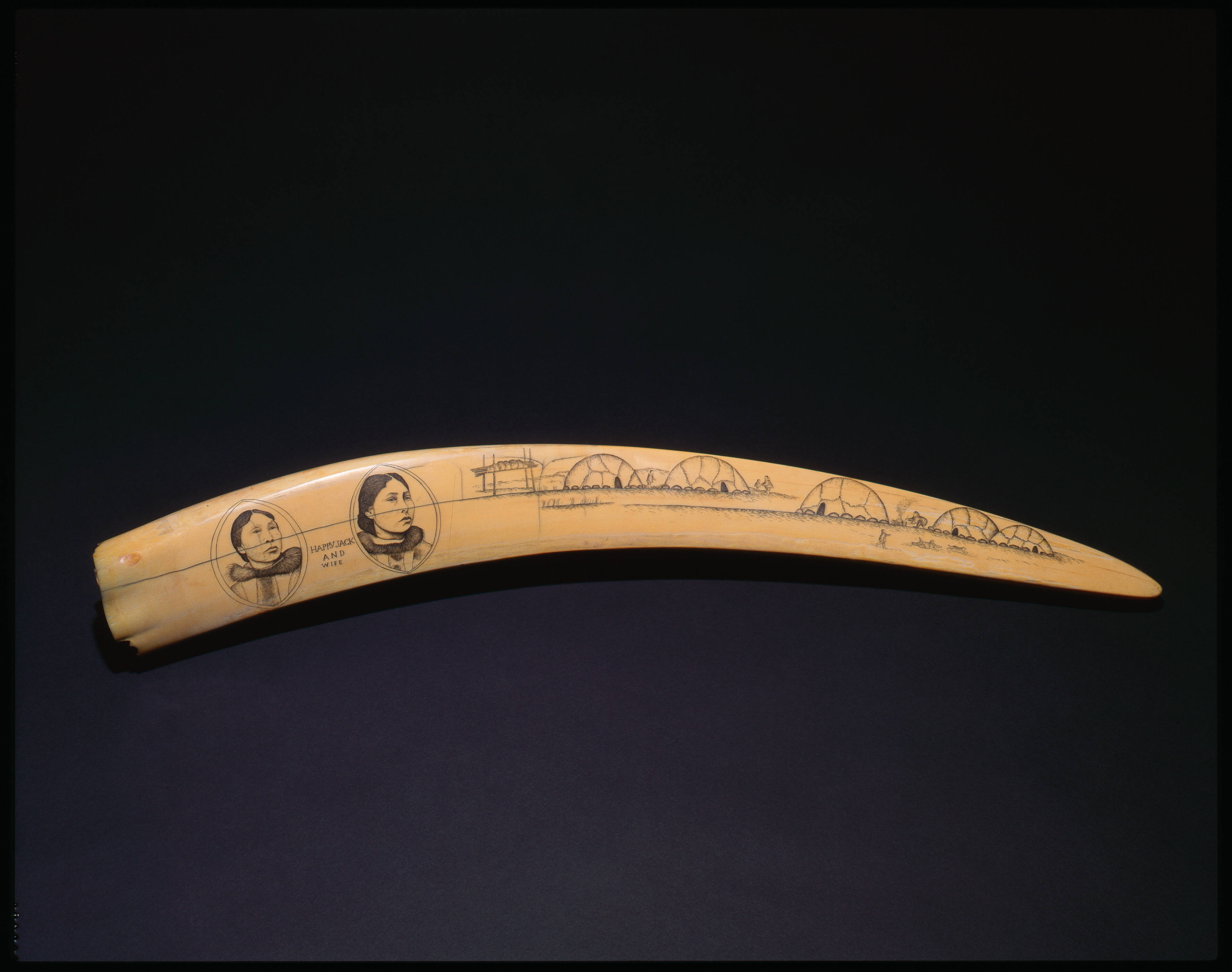 Label TextAngokwazhuk (Happy Jack), the artist of this double portrait of himself and his first wife, Malinda, began to carve toys and buttons during a period of convalescence. He then worked as a cabin boy aboard a whaling ship. There he saw sailors making scrimshaw, a decorative engraved carving done on whale’s teeth and walrus tusk. Angokwazhuk soon established himself in Nome as an important artist and residents and travelers eagerly sought his engravings. The summer encampment scene may be the work of another artist.Exhibition History"Treasures from the Thaw Collection," Wheelwright Museum of American Indian Art. Santa Fe, NM, May 1, 2000 - December 31, 2000.