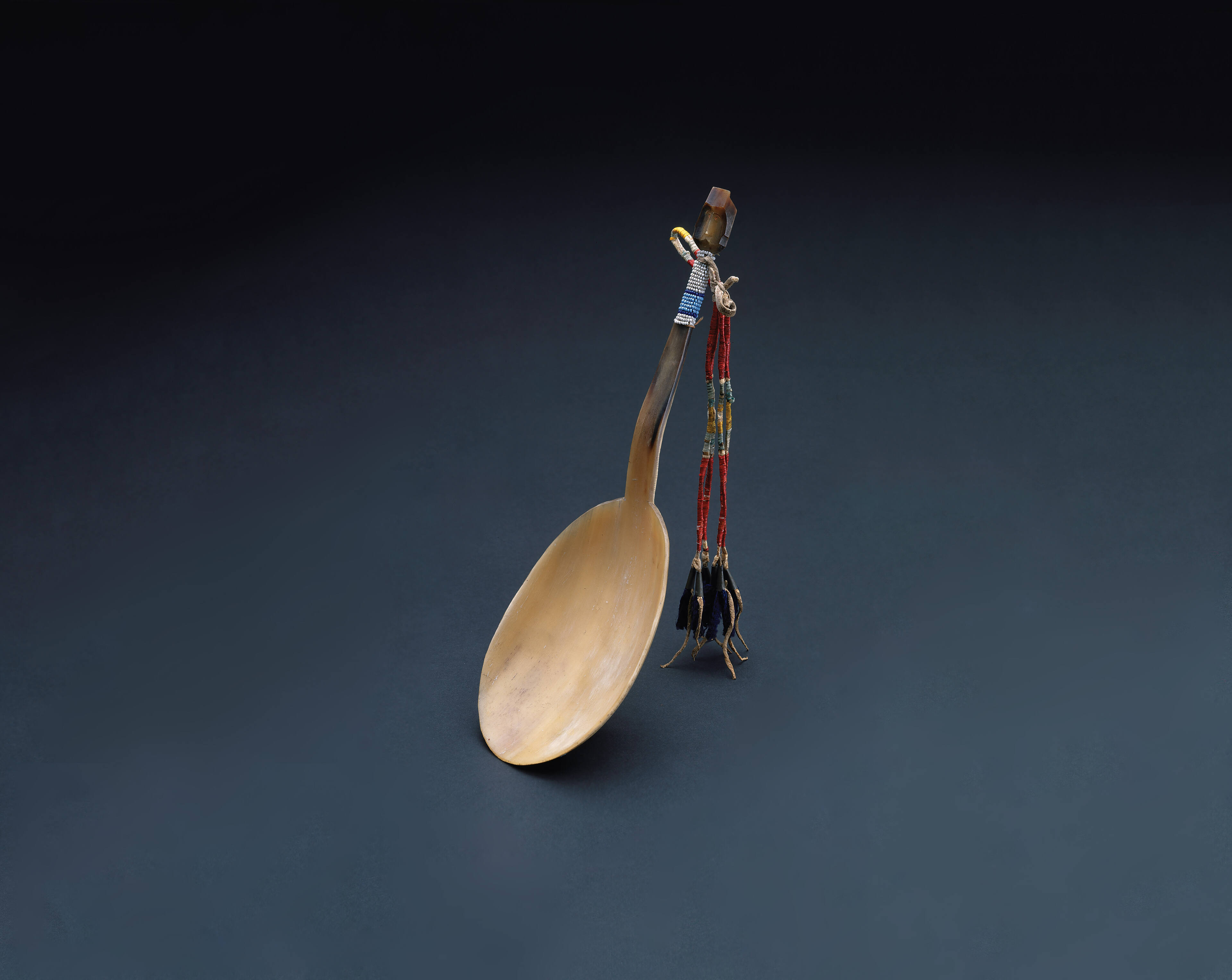 Label TextThis spoon depicts an Apsaalooke (Crow) warrior’s stylized face at the top of the handle. The imagery reveals the rivalry and ridicule between enemies. This spoon’s warrior owner would have used it on special occasions to suggest that his enemy was at his service and was presenting him with riches of the feast. The red and white quill- wrapped thongs with tin cone pendants also indicate that this was a feast spoon.